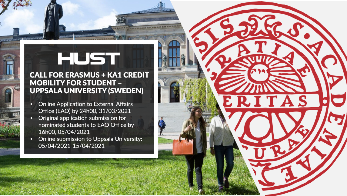 External Affair Office announces Erasmus KA1 credit mobility program between Hanoi University of Science and Technology and Uppsala University (Sweden) in the academic year of 2021-2022 as below: