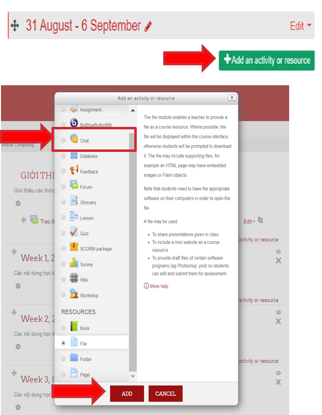 Bước 1. click chọn “Add an activity or resource” chọn tài nguyên học tập “File”