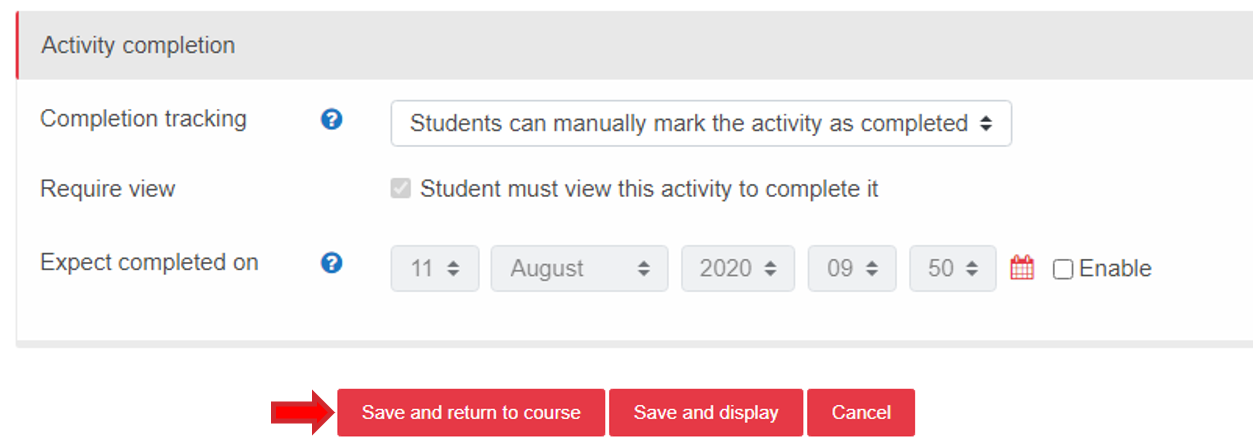 Bước 4. Ngoài ra còn có thể thiết lập đánh giá cho hoạt động Chat bằng tính năng Activity Completion sau đó chọn Save and return to course