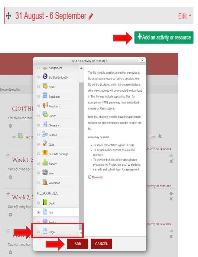 Bước 1. click chọn “Add an activity or resource” chọn tài nguyên học tập “Page”