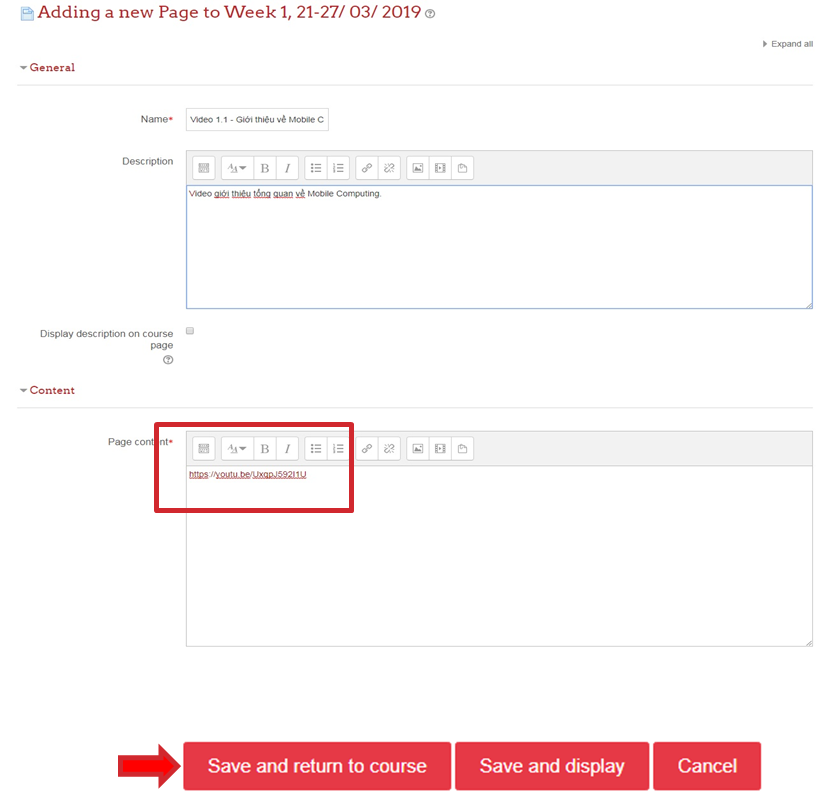 Bước 2. Cập nhật thông tin và đường dẫn tới video học tập tương ứng trong mục “content”, chọn “save and return to course”