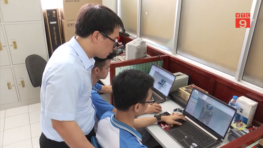 Associate Professor Vu Duy Hai (behind) instructs his students to design the ventilator in the laboratory in May 2020. Photo by VTC9