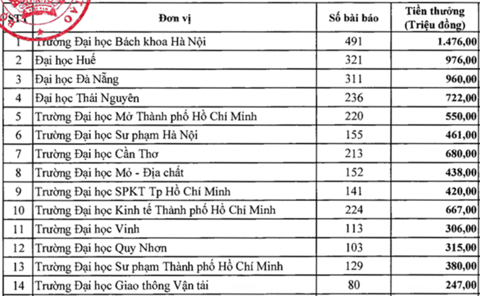 In 2020, 34 universities were awarded nearly 11 billion by Ministry of Education and Training for publishing scientific articles on international journals under ISI, SCI, SCIE. Hanoi University of Science and Technology has the highest number of articles – 491 with the amount of rewards nearly 1.5 billion; followed by Hue University and The University of Da Nang, receive over 960 million.