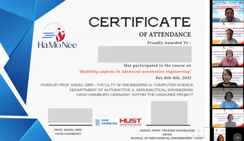 From 6 to 8 December 2021, Hamburg University of Applied Sciences (HAW Hamburg), in collaboration with Hanoi University of Science and Technology (HUST), held a series of virtual seminar for students from Advanced Engineer’s Program in Automotive Engineering of HUST. The lectures were organized within the framework of HaMoNee Project, given by Prof. Dr. Dirk Engel, Professor of Mechatronic Systems in Chassis Engineering (FuF) of HAW Hamburg.