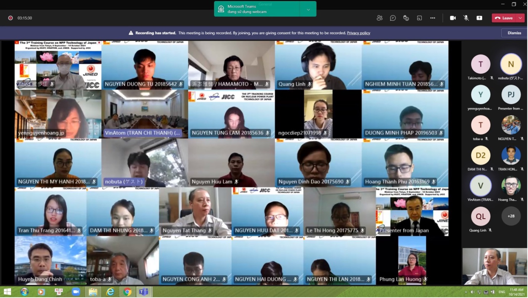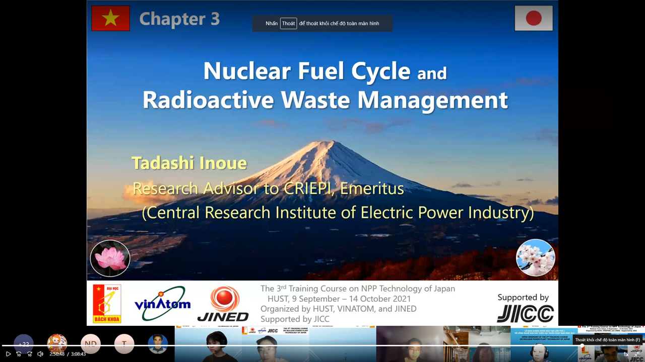 On Thursday morning (14th October), the closing ceremony of the 3rd Nuclear Power Plant Technology training course - jointly organized by Hanoi University of Science and Technology (HUST), Vietnam Institute of Atomic Energy (VINATOM), and Japan International Nuclear Energy Development Company (JINED) - was held online via Microsoft Teams platform.