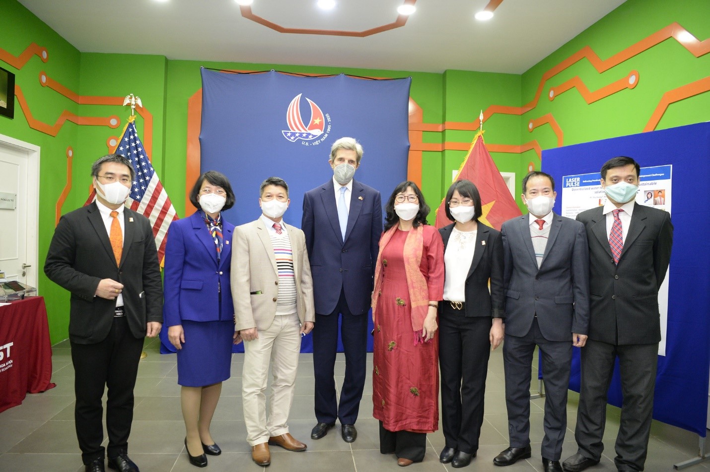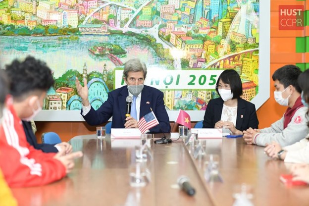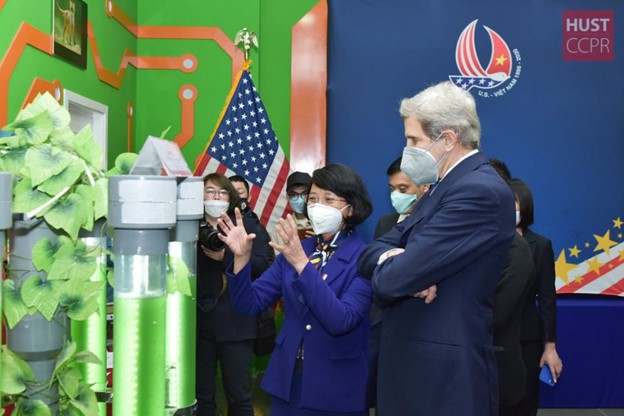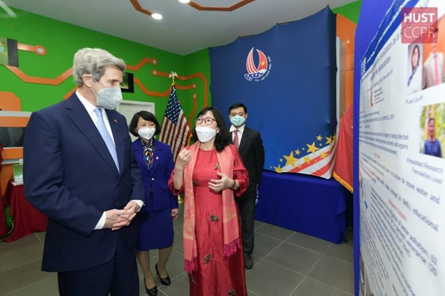 On 24th February 2022, Hanoi University of Science and Technology had an honor to welcome Secretary John Kerry to visit and participate in the climate change round table. Assoc Prof. Huynh Dang Chinh was pleased to show Secretary Kerry and his delegation research projects related to the environment led by three scientists: Associate Professor (A. P). Hoang Thi Thu Huong, Assoc Prof. Doan Thi Thai Yen, and Dr. Han Huy Dung.