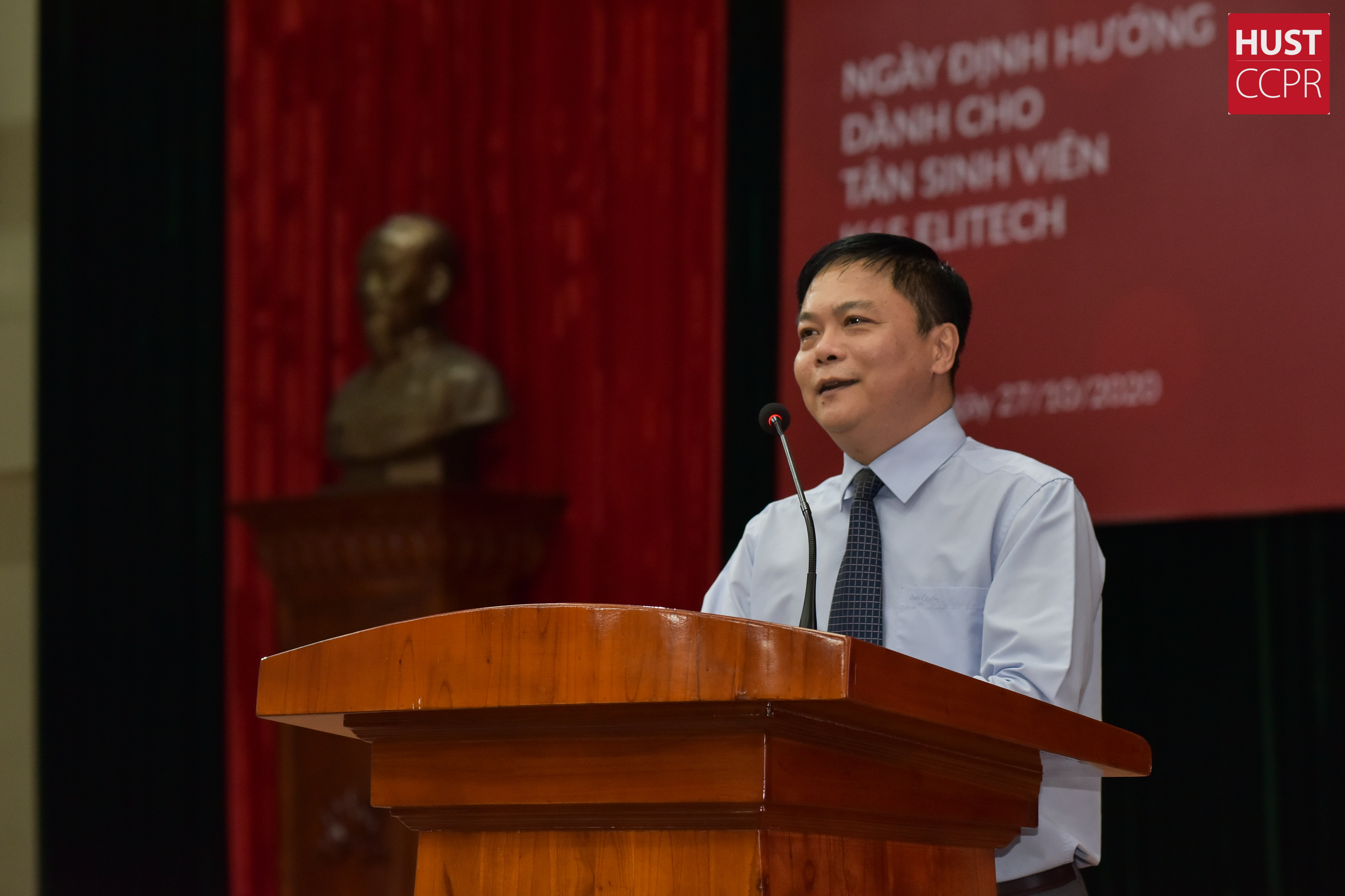 PGS. Nguyễn Phong Điền, Phó Hiệu trưởng Đại học Bách khoa Hà Nội, phát biểu chào mừng tại Ngày định hướng dành cho tân sinh viên ELiTECH ngày 27/10/2020. Ảnh: CCPR-Ngọc Hải