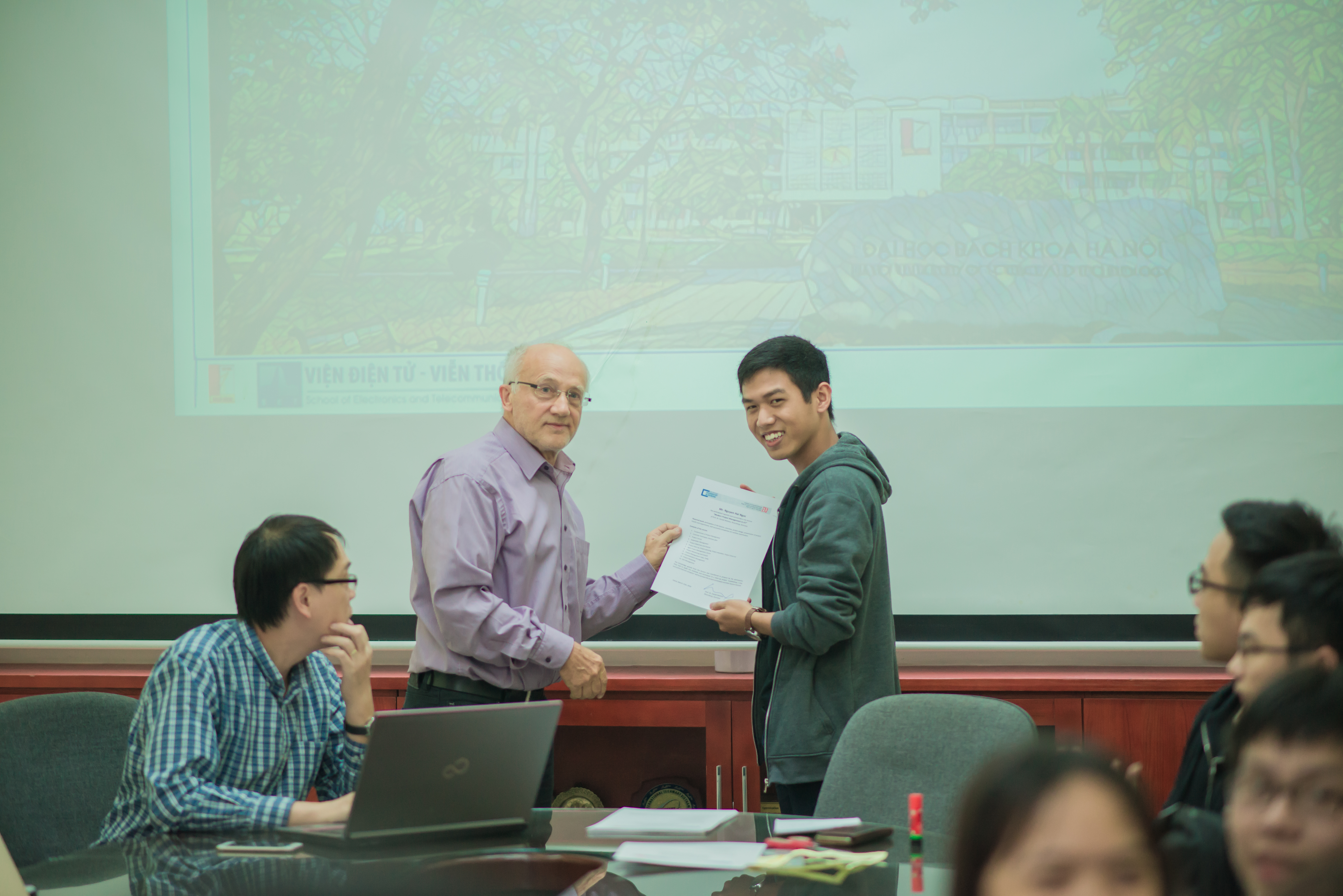 Sinh viên chương trình tiên tiến Kỹ thuật Điện tử - Viễn thông nhận chứng chỉ hoàn thành môn Cơ sở kỹ thuật mạng của GS. Trần Gia Phước, Nguyên phó hiệu trưởng trường Đại Học Wuerzbug, CHLB Đức ngày 1/3/2019