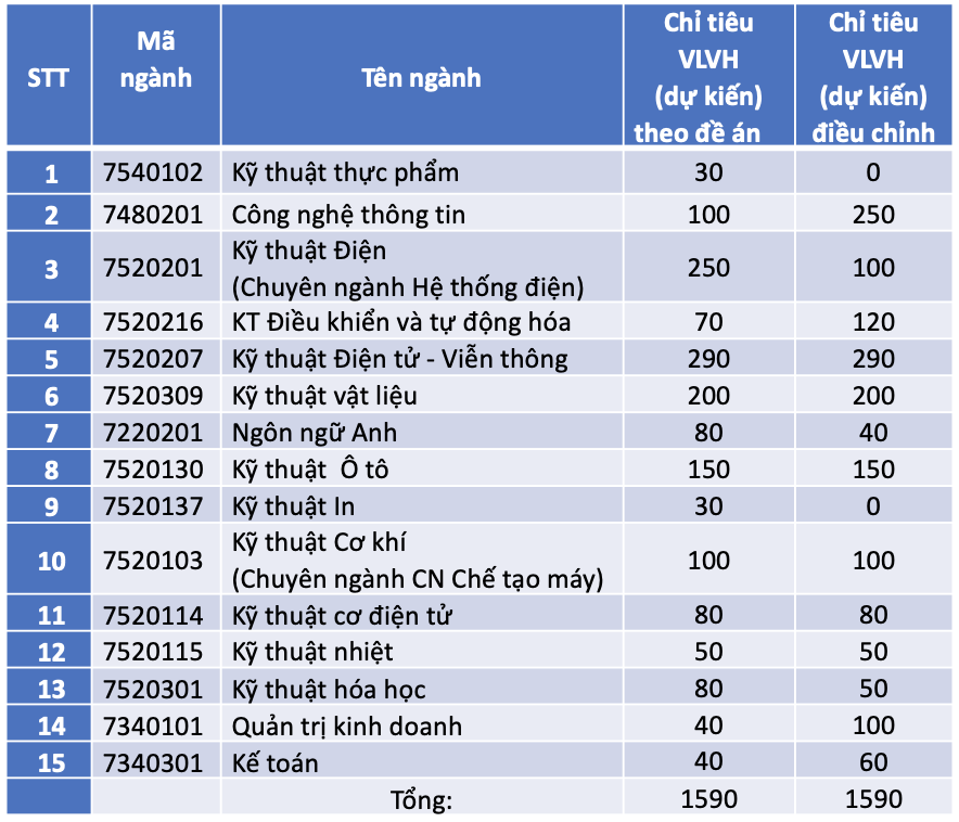 Điều chỉnh chỉ tiêu tuyển sinh vừa làm vừa học trình trình độ đại học tại Phần III, Mục 3 của Đề án tuyển sinh đại học năm 2021 đối với một số ngành/CTĐT, cụ thể như sau: