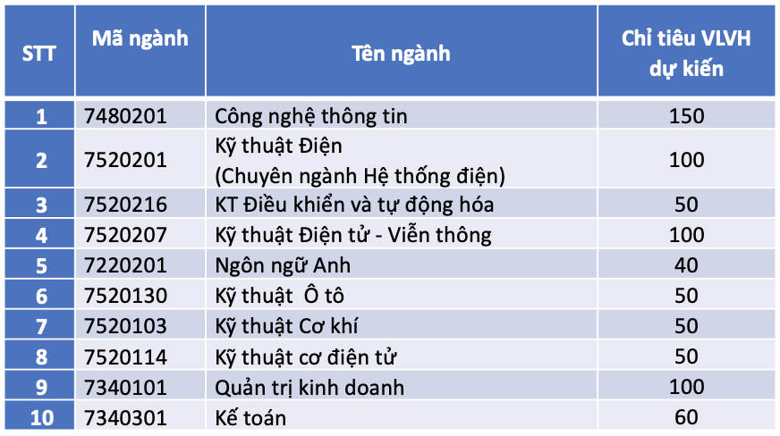 Bảng 2 – Chỉ tiêu tuyển sinh hình thức VHVL trình độ đại học dài hạn