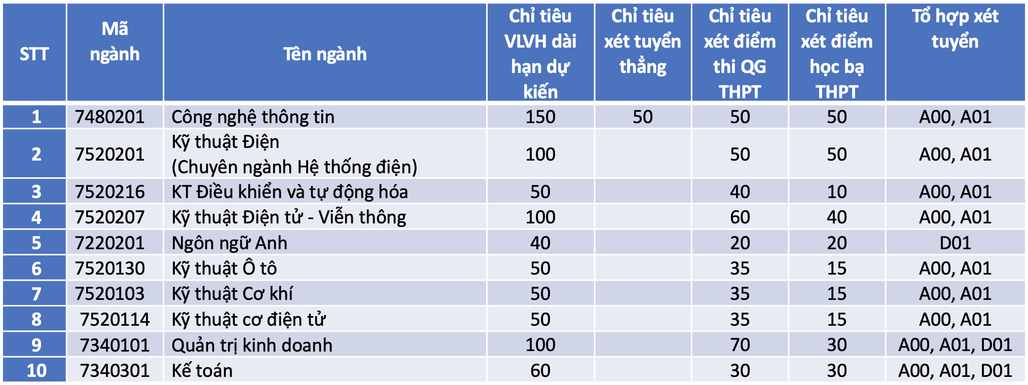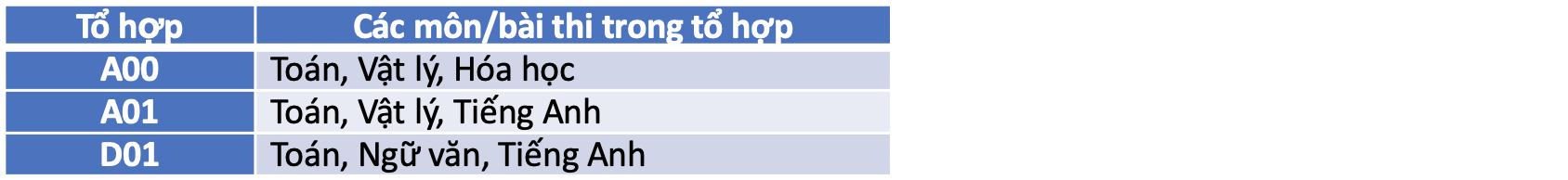 Điểm xét từng ngành, chương trình đào tạo xác định theo tổng điểm 3 môn thi của các tổ hợp A00, A01 và D01, có tính điểm ưu tiên khu vực (KV) và đối tượng (ĐT) theo quy định của Bộ Giáo dục và Đào tạo. Chỉ tiêu xét tuyển xem Bảng 3.