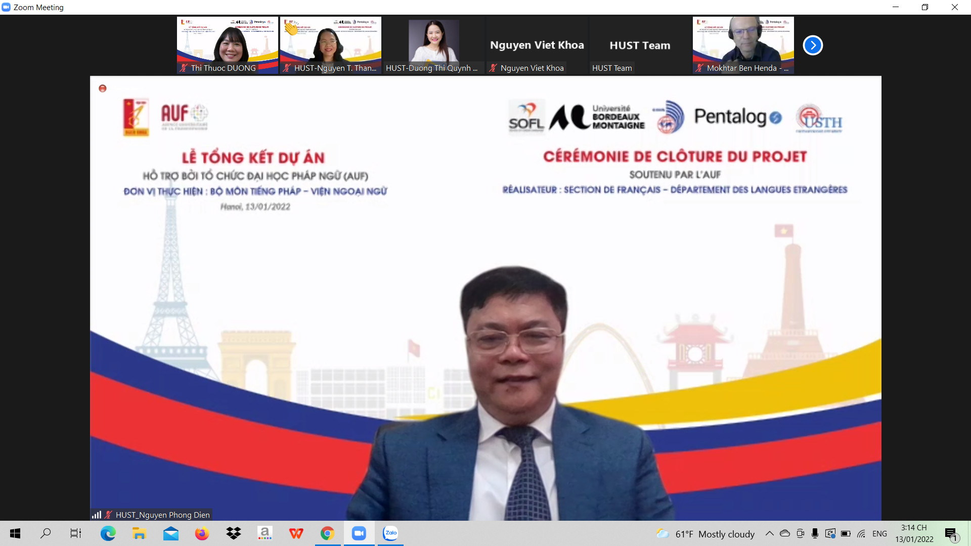 Ngày 13/1/2022, tại Trường Đại học Bách khoa Hà Nội diễn ra Lễ tổng kết Dự án “Cải tiến việc dạy và học tiếng Pháp nhằm nâng cao tỷ lệ đạt chuẩn đầu ra tại Trường Đại học Bách khoa Hà Nội thông qua việc áp dụng các khóa học theo hình thức kết hợp (Blended Learning)” do Tổ chức Đại học Pháp ngữ hỗ trợ, Bộ môn Tiếng Pháp, Viện Ngoại ngữ thực hiện. Buổi lễ được tổ chức theo hình thức trực tuyến.