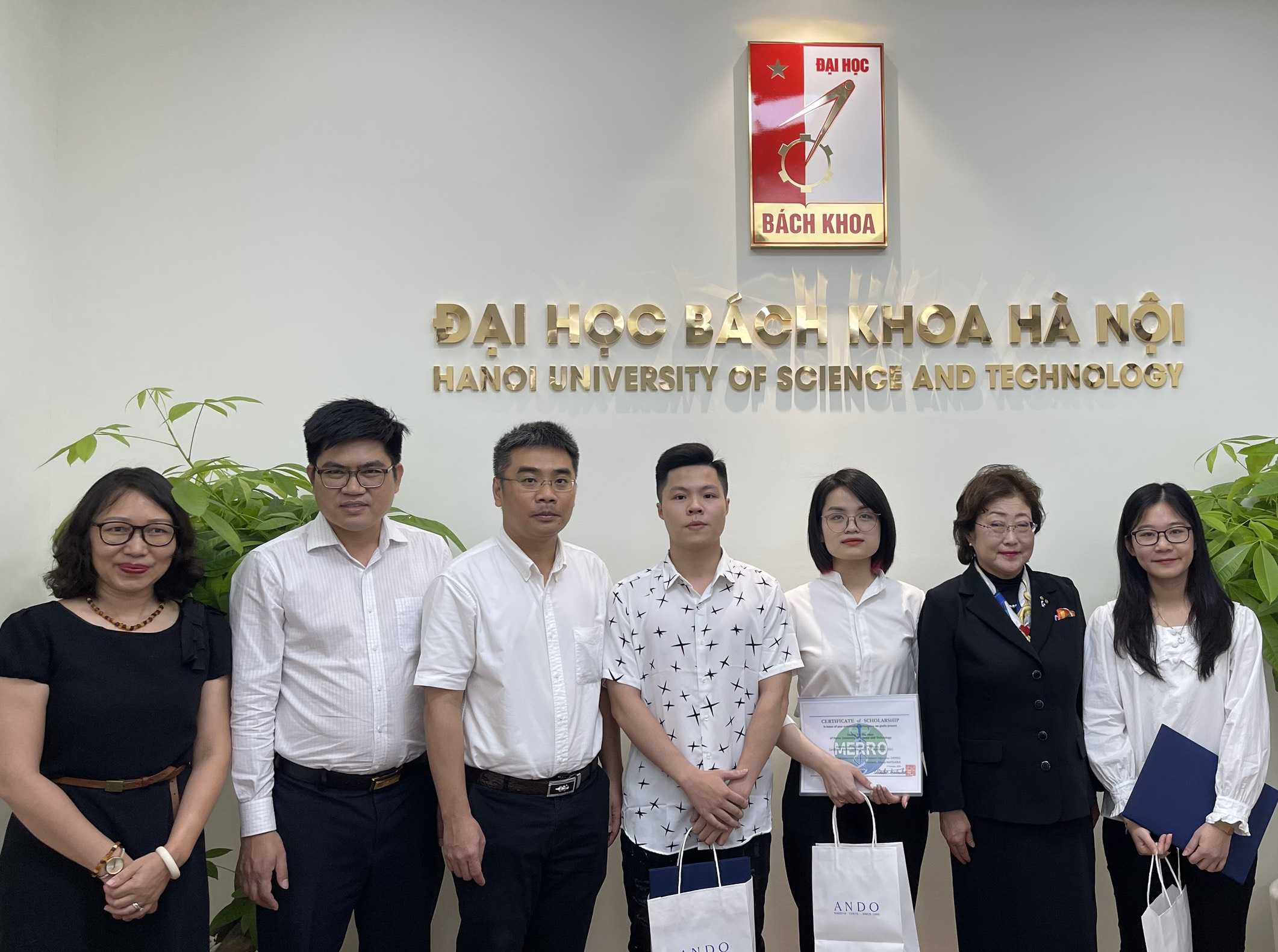 Bà Atsuko Matsuoka (thứ hai từ trái sang) trao học bổng và chứng nhận cho 3 sinh viên cùng sự chứng kiến của các giảng viên Bách khoa Hà Nội. Ảnh: Mai Chi