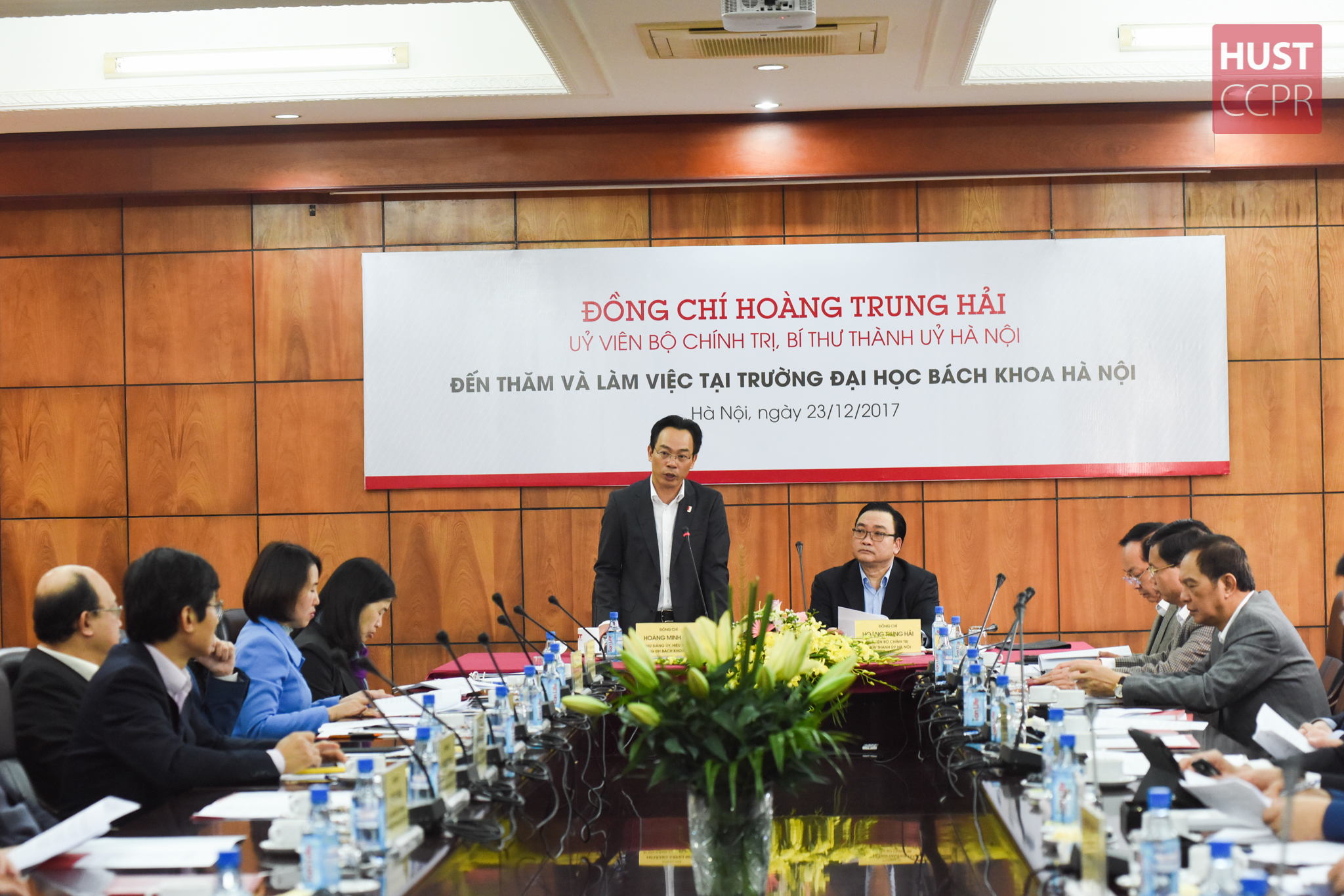Mở đầu buổi làm việc, PGS Hoàng Minh Sơn báo cáo tóm tắt về cơ cấu tổ chức, kết quả hoạt động năm 2017, Chiến lược phát triển của Trường giai đoạn 2017-2025 và phương hướng nhiệm vụ năm 2018. Theo đó, năm 2017 là năm đầu tiên thực hiện Đề án tự chủ toàn diện, Trường đã đạt được nhiều kết quả tiêu biểu trên tất cả các mảng hoạt động của Trường như: Xây dựng và ban hành Chiến lược phát triển 2017-2025. Nhằm cụ thể hóa các giải pháp trong Chiến lược, năm 2017, Trường đã xây dựng Quy chế tổ chức và hoạt động, Quy chế quản lý tài chính, Quy chế công tác cán bộ, tạo tiền đề cho việc đổi mới và ứng dụng mô hình quản trị tiến tiến, đẩy mạnh thực hiện cơ chế tự chủ, tự chịu trách nhiệm. Tháng 6/2017, ĐHBK Hà Nội là một trong bốn trường đại học đầu tiên của cả nước được công nhận đạt kiểm định trường theo tiêu chuẩn châu Âu bởi Hội đồng đánh giá cấp cao HCERES của Pháp…