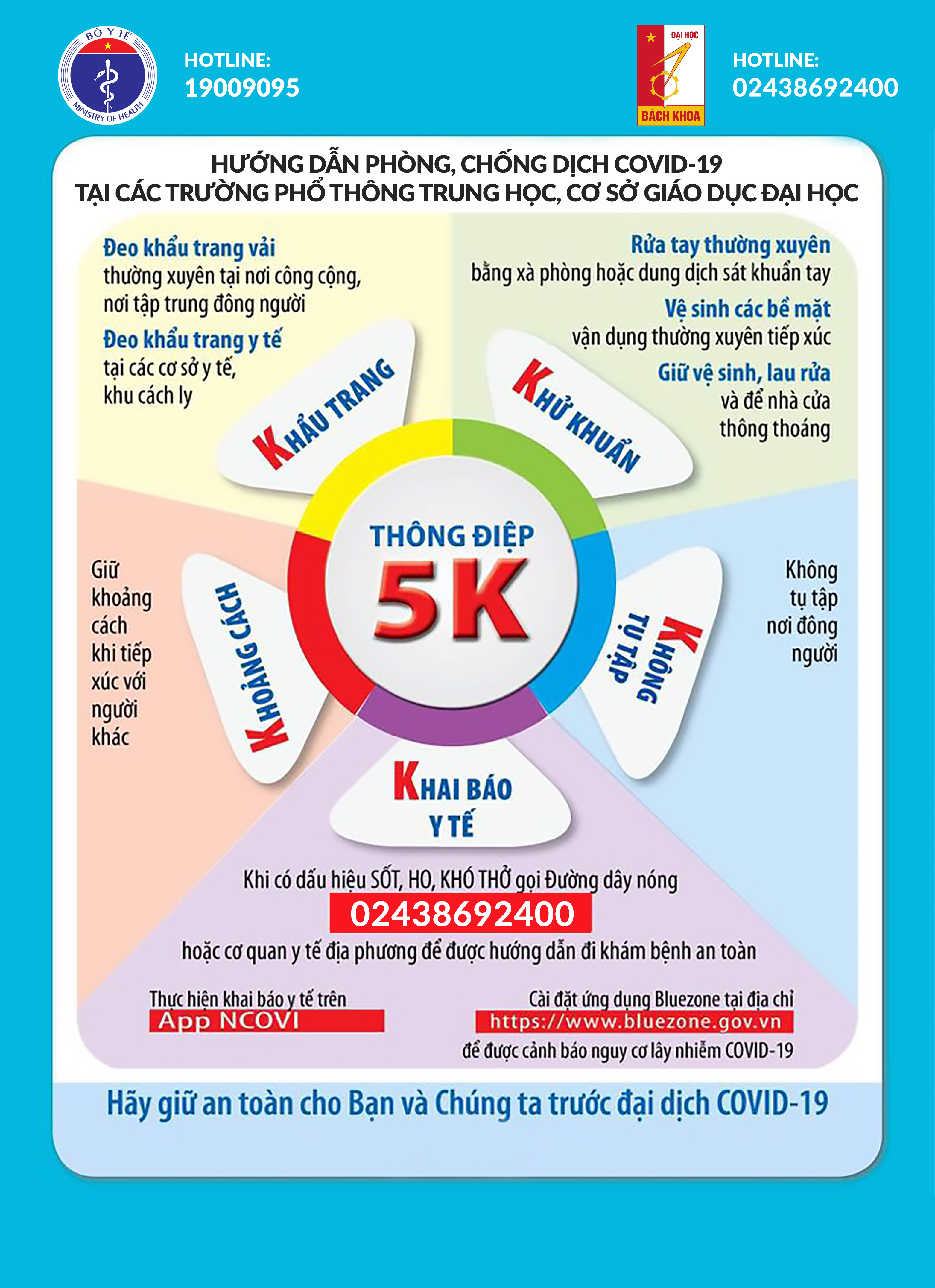 - Chủ động theo dõi tình hình sức khỏe, nếu có dấu hiệu dịch tễ (Sốt, Ho, Khó thở) thì ở nguyên tại chỗ, liên hệ ngay Trung tâm Y tế Bách khoa hoặc cơ quan y tế gần nhất để được tư vấn, báo đường dây nóng 24/7 của Trường: 02438692400.