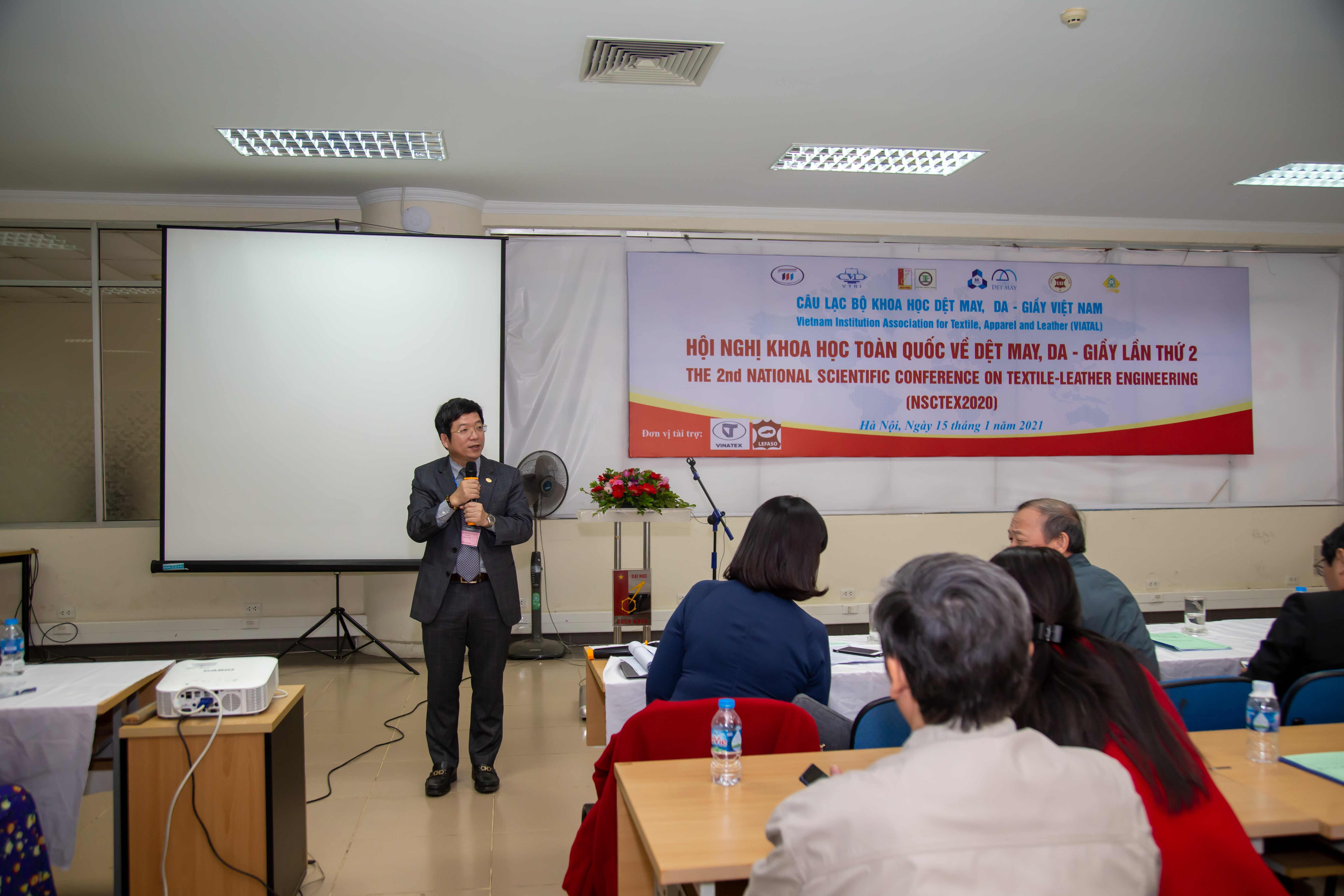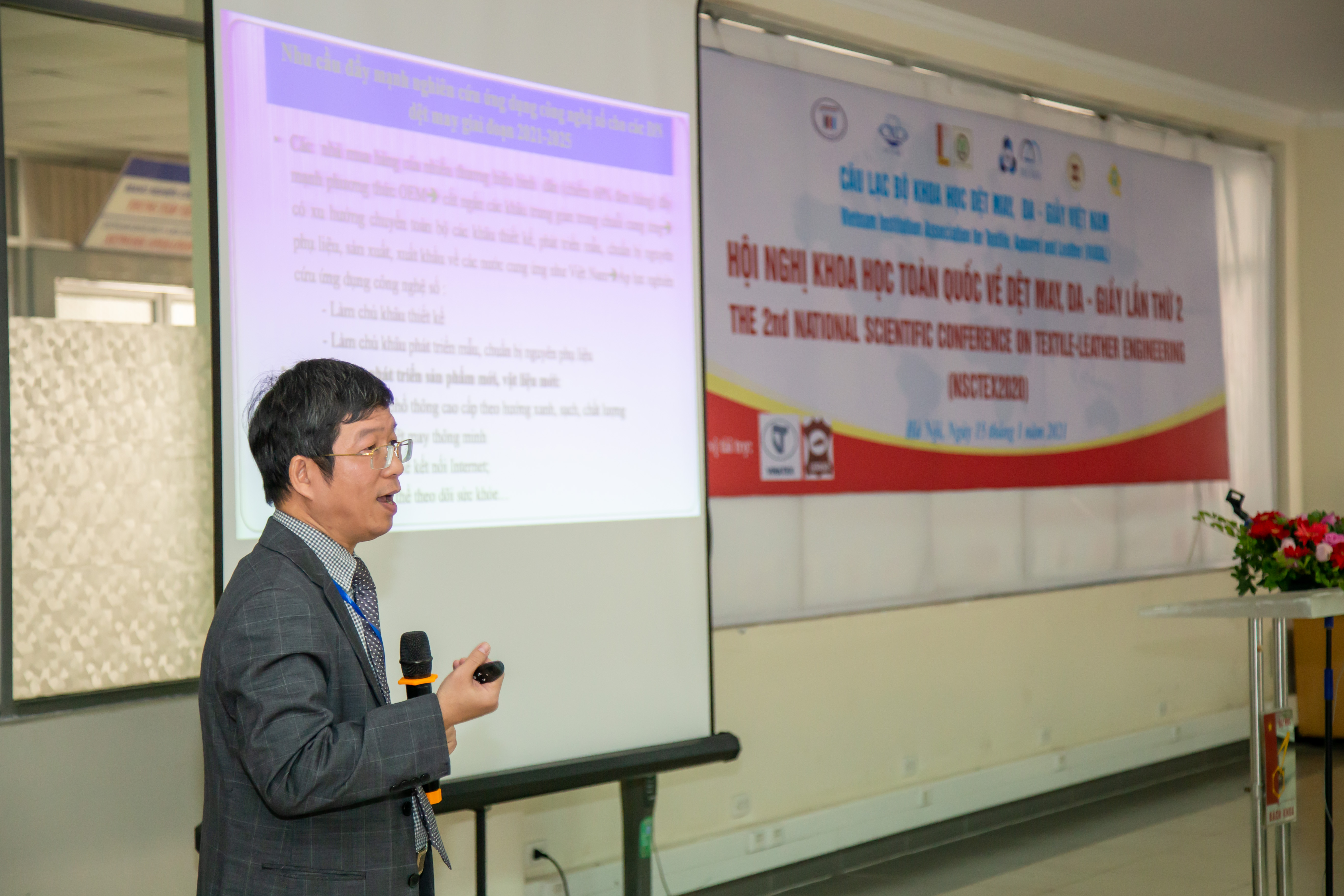 TS. Hoàng Xuân Hiệp, Hiệu trưởng Trường Đại học Công nghiệp Dệt May Hà Nội, trình bày tham luận tại Hội nghị Khoa học Toàn quốc về Dệt, May và Da Giày lần thứ 2 tổ chức ngày 15/1 tại Thư viện Tạ Quang Bửu. Ảnh: Tiến Được.