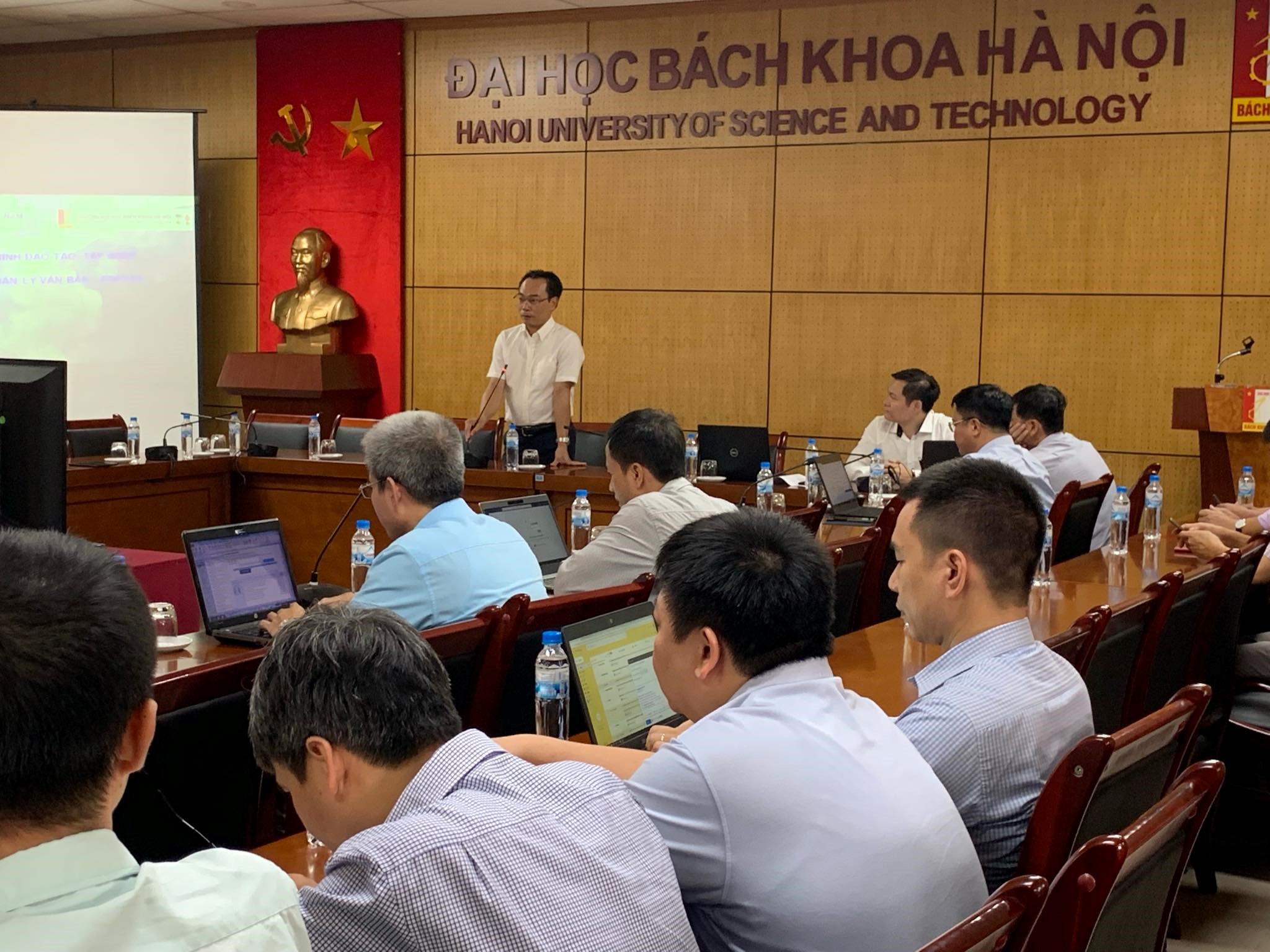 Ông Phạm Ngọc Hiển đã báo cáo tình hình triển khai phần mềm E-OFFICE 3.0 tại nhà trường. Từ thực tế triển khai, EVNICT và Tổ trưởng tổ công tác Xây dựng hệ thống thông tin quản trị ĐHBKHN đề xuất phương án để việc chuyển giao diễn ra cách nhanh chóng và đạt hiệu quả cao nhất: Thành lập đội ngũ hỗ trợ chuyên nghiệp tại HUST, sẵn sàng hỗ trợ tại chỗ trong suốt quá trình triển khai các chức năng, hỗ trợ sử dụng,…