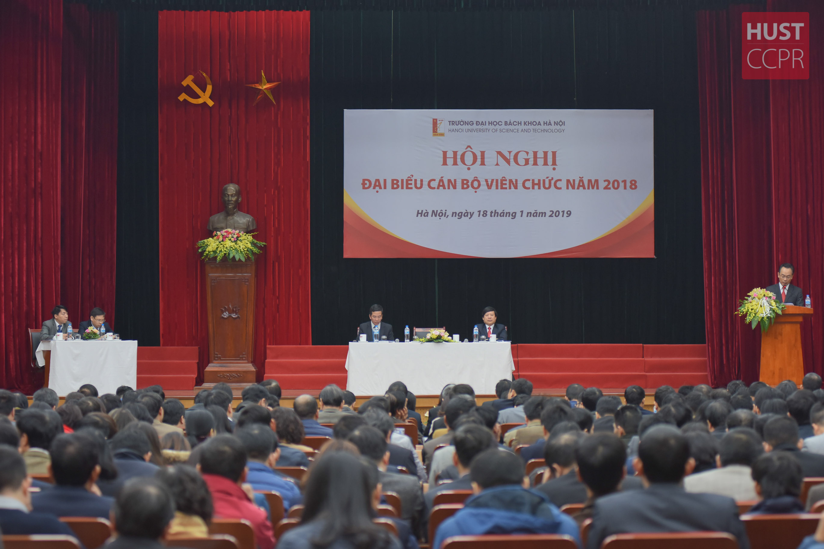Hội nghị đã bầu ra đoàn Chủ tọa và Thư ký để điều hành Hội nghị. Thay mặt đoàn Chủ tọa, PGS Hoàng Minh Sơn đã báo cáo tóm tắt kết quả thực hiện Nghị quyết Hội nghị cán bộ viên chức Trường năm 2017 với 10 nội dung chính: Đổi mới tổ chức và quản trị nâng cao hiệu quả bộ máy; Phát huy tiềm năng và nâng cao năng lực đội ngũ cán bộ; Phát triển khuôn viên, hiện đại hóa cơ sở vật chất; Phát triển đào tạo chất lượng cao định hướng thị trường; Tập trung nguồn lực, nâng cao năng lực và hiệu quả nghiên cứu; Xây dựng cơ chế hỗ trợ khởi nghiệp và thúc đẩy chuyển giao công nghệ; Xây dựng hệ thống tài chính vững mạnh; Nâng cao chất lượng các hoạt động hỗ trợ sinh viên; Xây dựng và triển khai chiến lược phát triển hợp tác – đối ngoại; Tăng cường công tác truyền thông và phát triển thương hiệu.