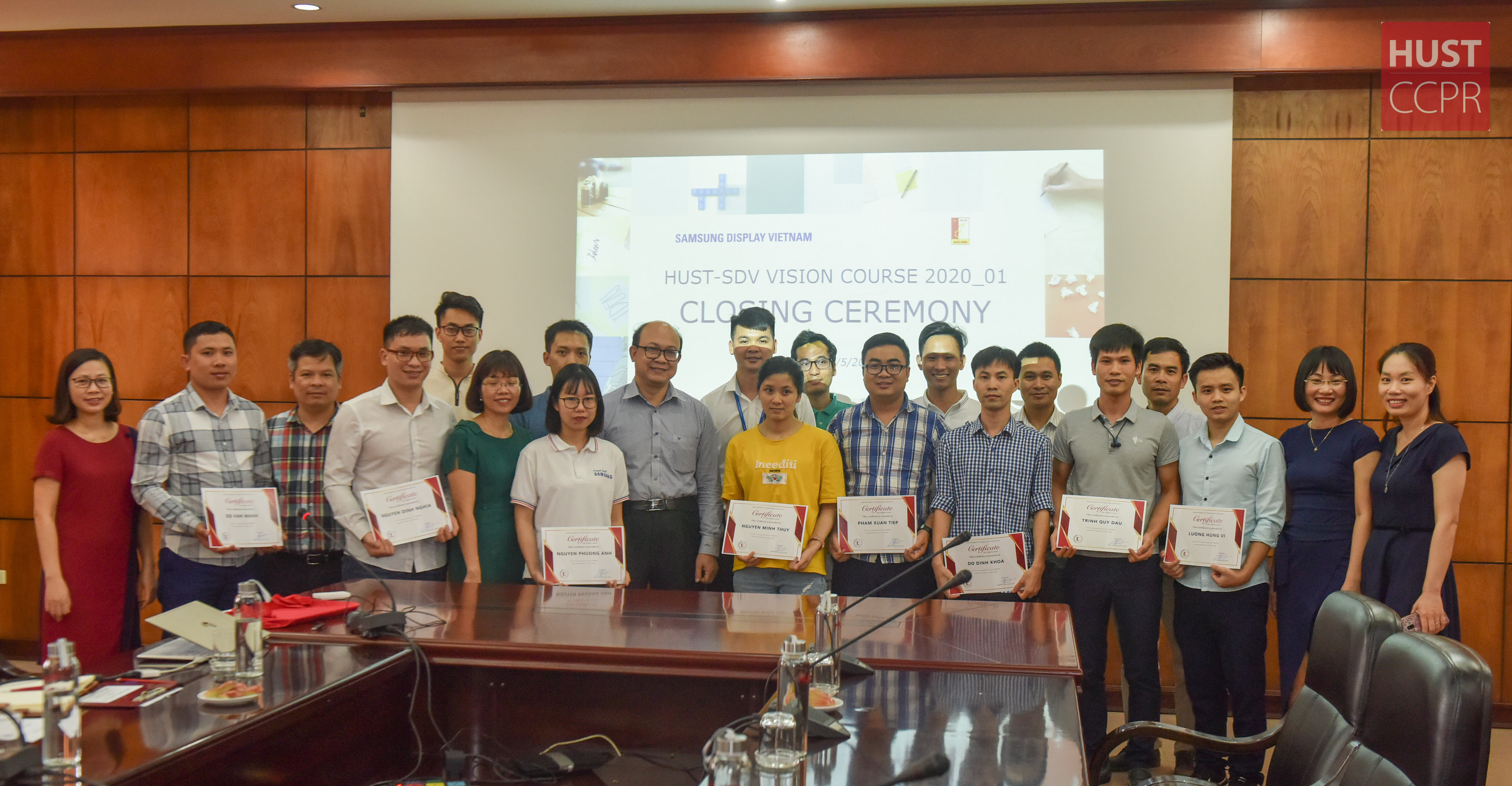 Chiều nay (19/5/2020), PGS.TS Huỳnh Quyết Thắng – Phó Hiệu trưởng Trường ĐHBKHN đã chủ trì Lễ bế giảng và trao chứng chỉ hoàn thành khóa học cho các học viên của Khóa đào tạo chuyên sâu về Thị giác máy tính (gọi tắt là VISION) – mô hình hợp tác đào tạo hiệu quả giữa Trường ĐHBK HN và Công ty TNHH Samsung Display Vietnam (SDV).