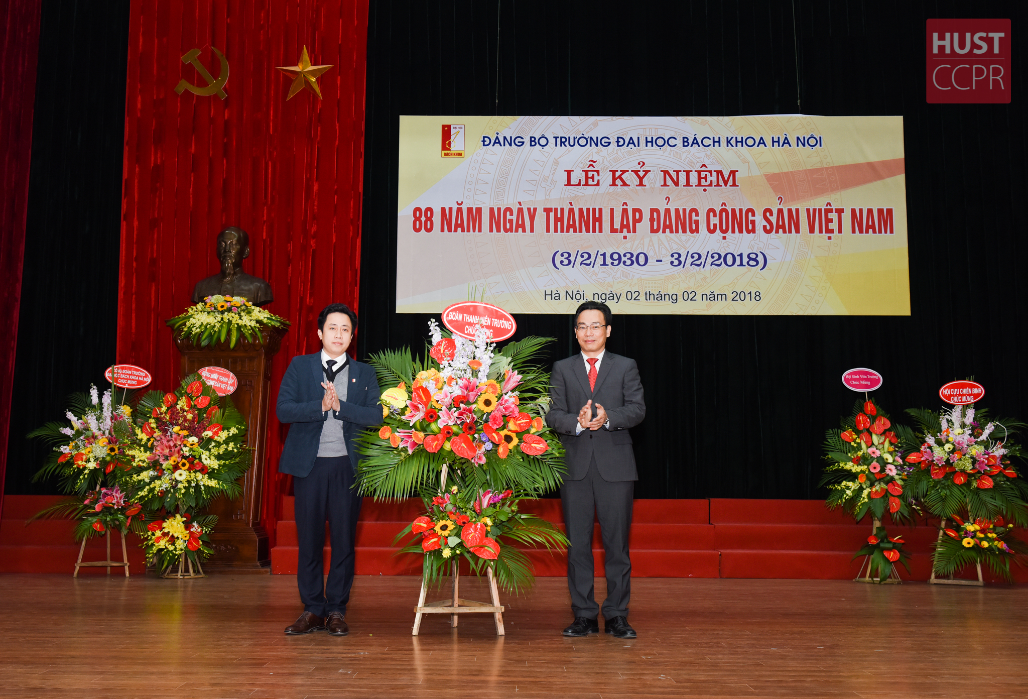 Thay mặt cho tuổi trẻ Bách khoa cũng như toàn thể đảng viên, CBVC Trường, TS Lê Đức Tùng đã gửi tặng lãng hoa chúc mừng thể hiện trách nhiệm, tinh thần đoàn kết, chung sức, chung lòng cùng với sự lãnh đạo của Đảng ủy và Ban Giám hiệu quyết tâm xây dựng Trường xứng đáng là ngọn cờ tiên phong đổi mới trong hệ thống giáo dục Việt Nam, góp phần xây dựng đất nước giàu mạnh.