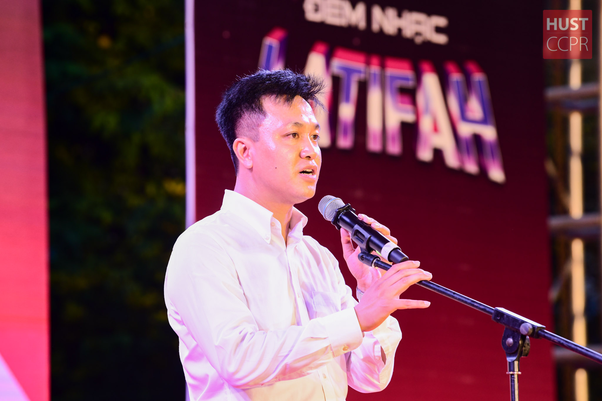 Đồng chí Trương Công Tuấn, Bí thư Đoàn Trường Đại học Bách khoa Hà Nội, phát biểu trong đêm nhạc ngày 22/8