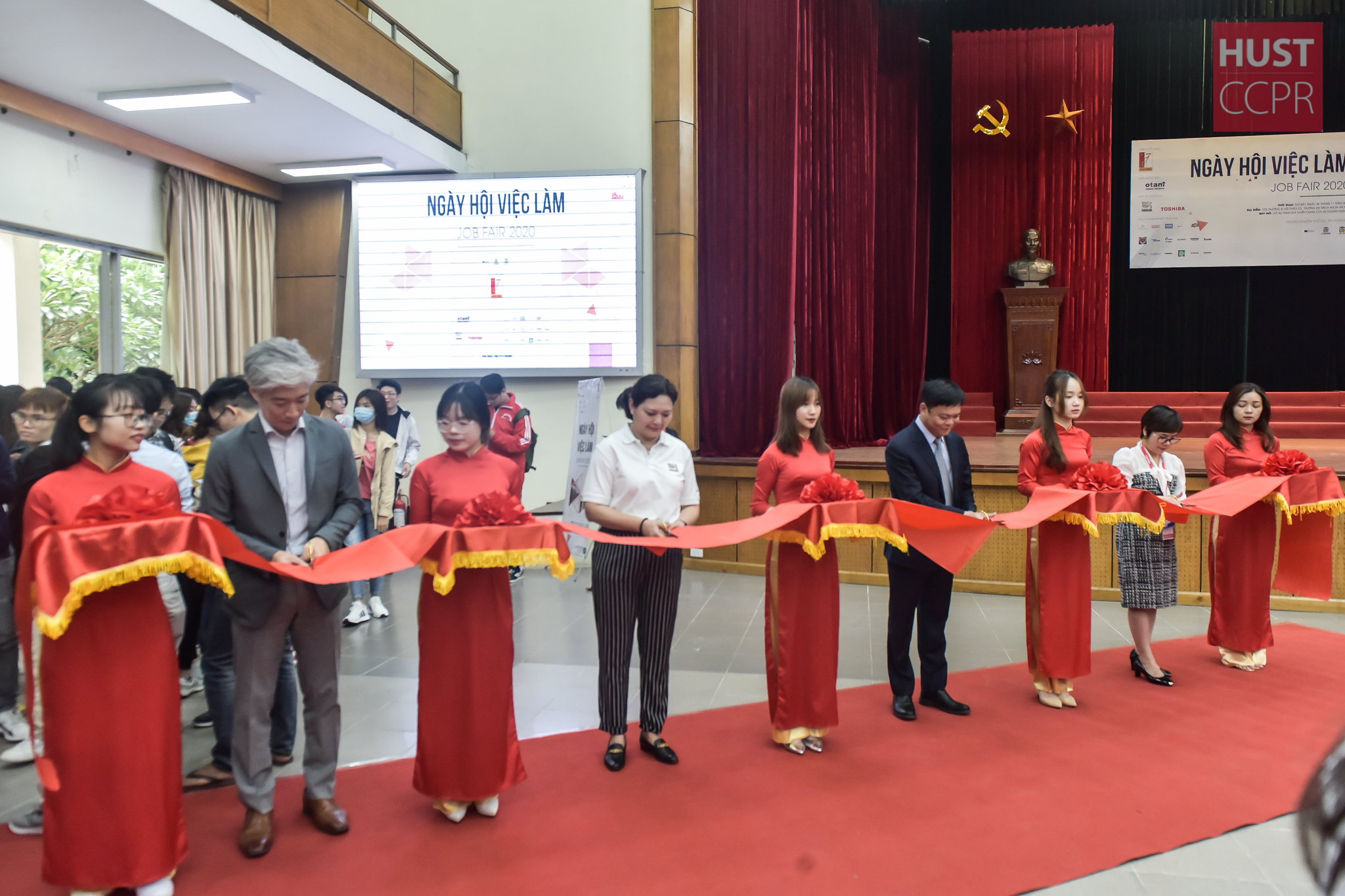 Lãnh đạo trường ĐHBK Hà Nội và đại diện các doanh nghiệp cắt băng khai mạc Ngày hội việc làm Job Fair 2020. Ảnh: Lê Ngọc Hải