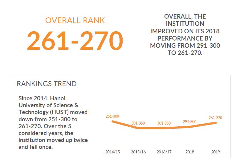 Với tiêu chí “Mạng lưới nghiên cứu quốc tế” lần đầu tiên được đưa vào đánh giá, Trường ĐHBK Hà Nội được đánh giá đứng thứ135 trong khu vực, vị trí tương đối cao. Ở tiêu chí khảo sát ý kiến nhà tuyển dụng về chất lượng sinh viên tốt nghiệp, Trường ĐHBK Hà Nội đã có bước tăng đáng kể lên mức 161. Với tiêu chí “Tỷ lệ sinh viên đến trao đổi” Trường cũng có mức tăng lên 215. Mặc dù bị giảm so với năm 2018, nhưng tiêu chí “số lượng giảng viên là tiến sĩ”đã dần tiệm cận với mức trung bình khu vực, đạt 65.9 so với 69.9. Như vậy, với vị trí 261-270 trong bảng xếp hạng QS Asia 2018-2019, tăng gần 100 bậc so với năm 2013.