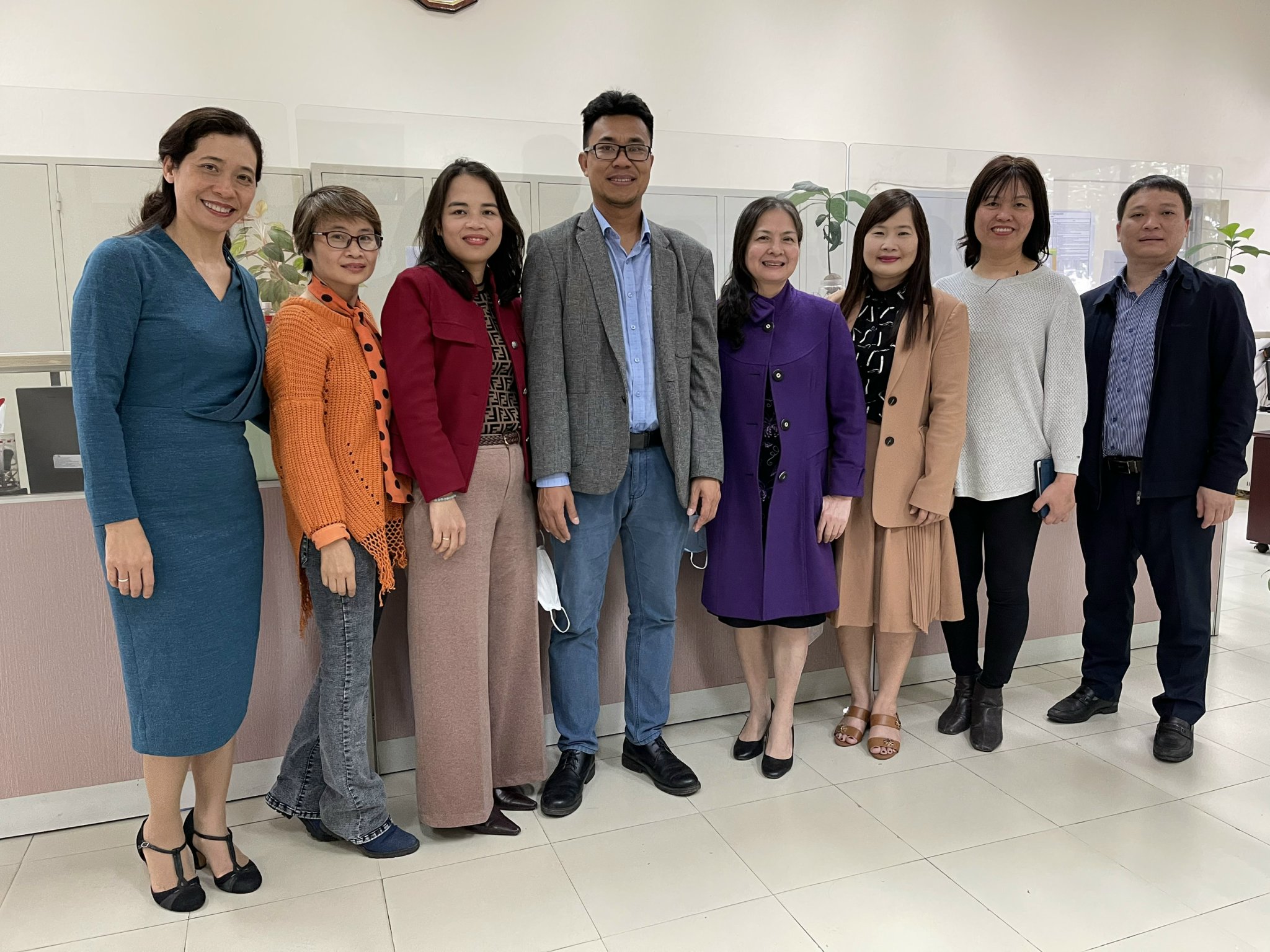 PGS. Đinh Văn Hải - Trưởng phòng CTSV (thứ 4 từ trái qua), TS. Phạm Mạnh Hùng - Phó Trưởng phòng CTSV (ngoài cùng bên phải) - cùng đội ngũ điều phối, tư vấn Tổ tư vấn tâm lý sinh viên