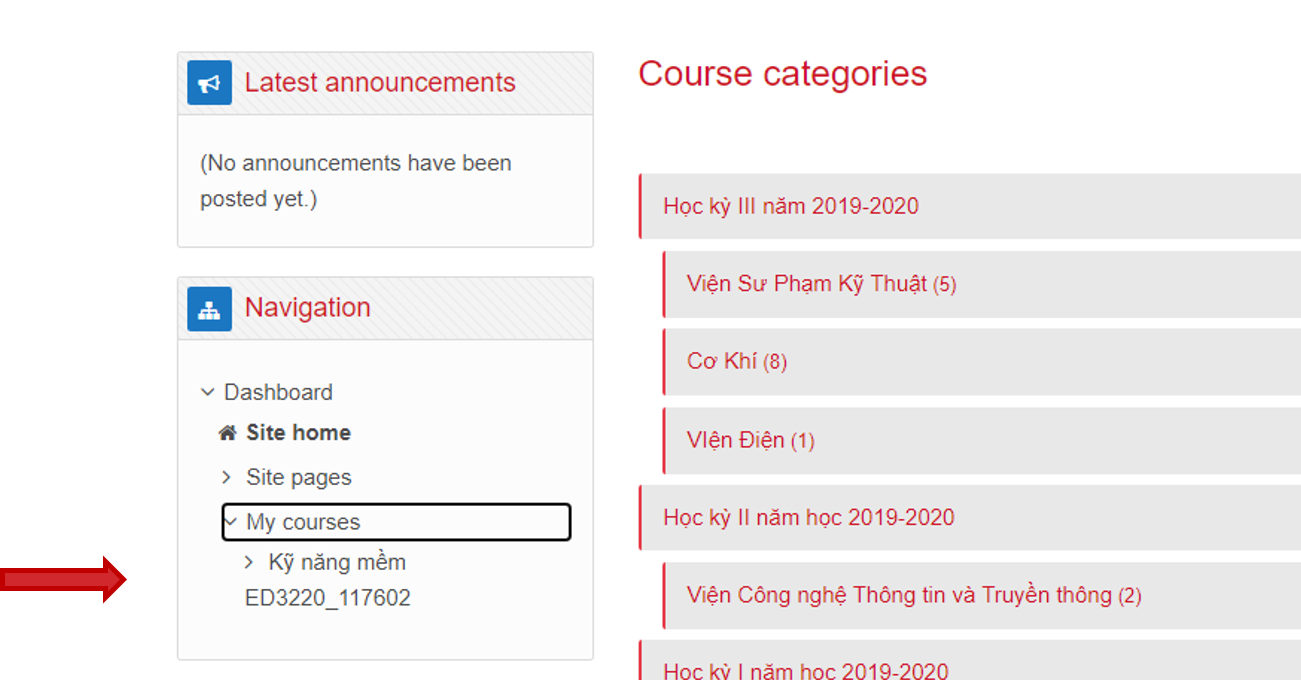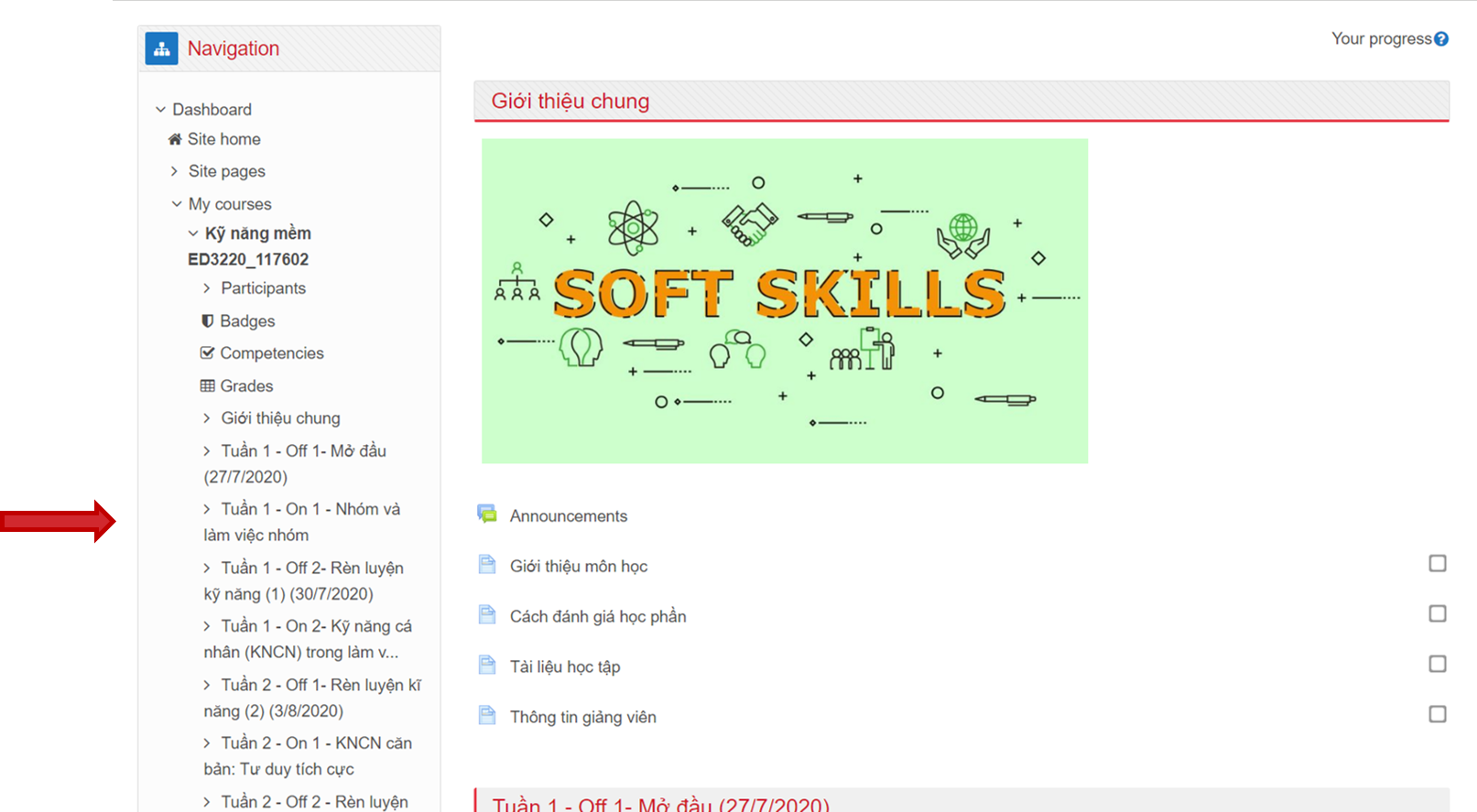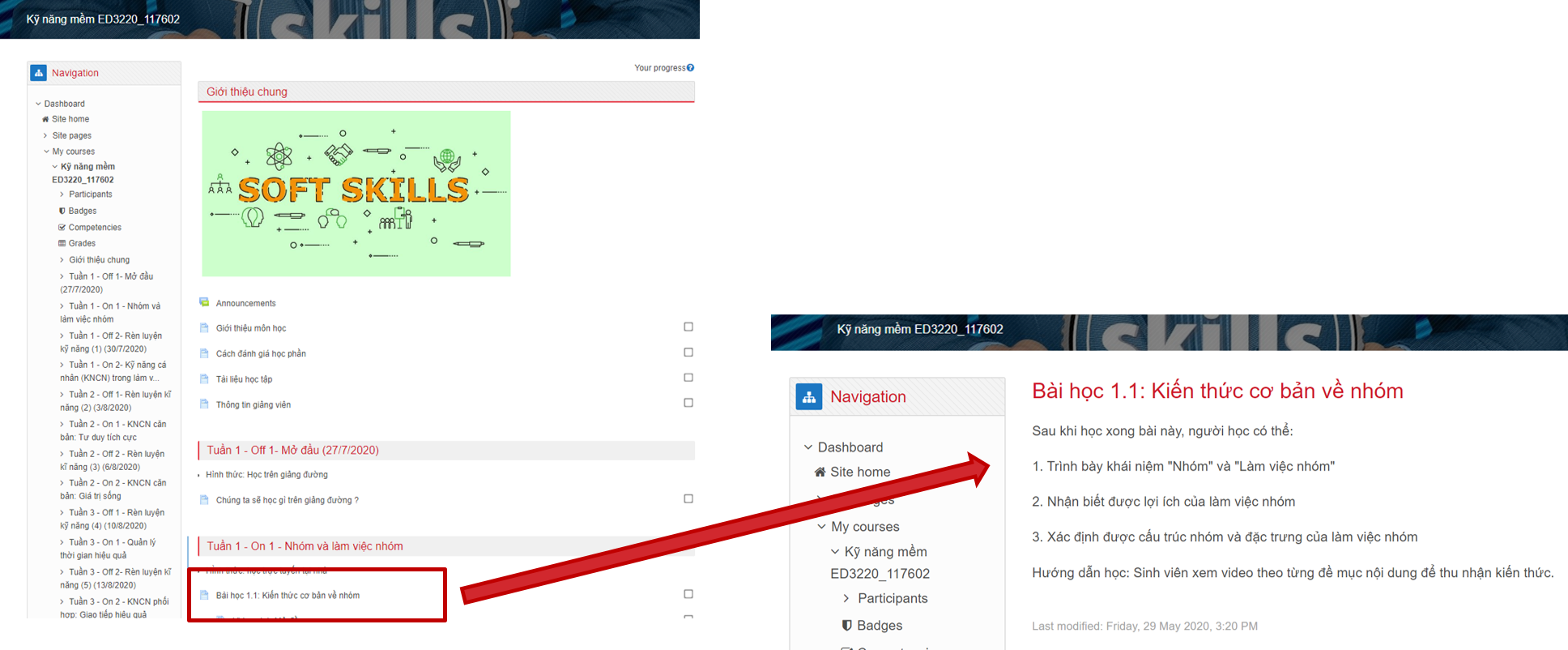 Bước 1. Click chon nội dung học được phân theo bài , theo tuần của môn học tại cột Navigation bên trái