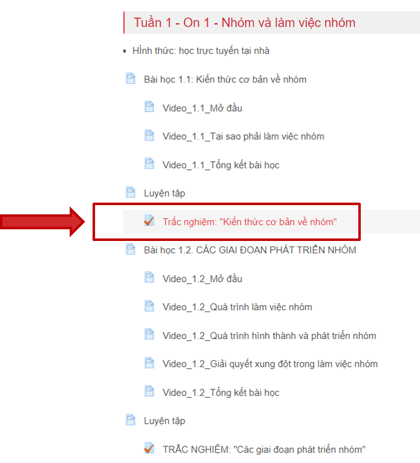Bước 1. Click chọn bài trong tuần có nội dung cần làm trắc nghiệm có biểu tượng