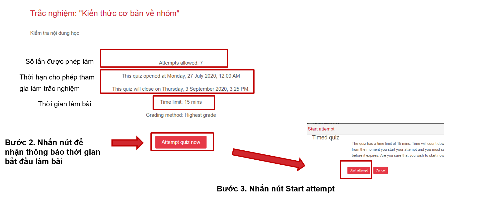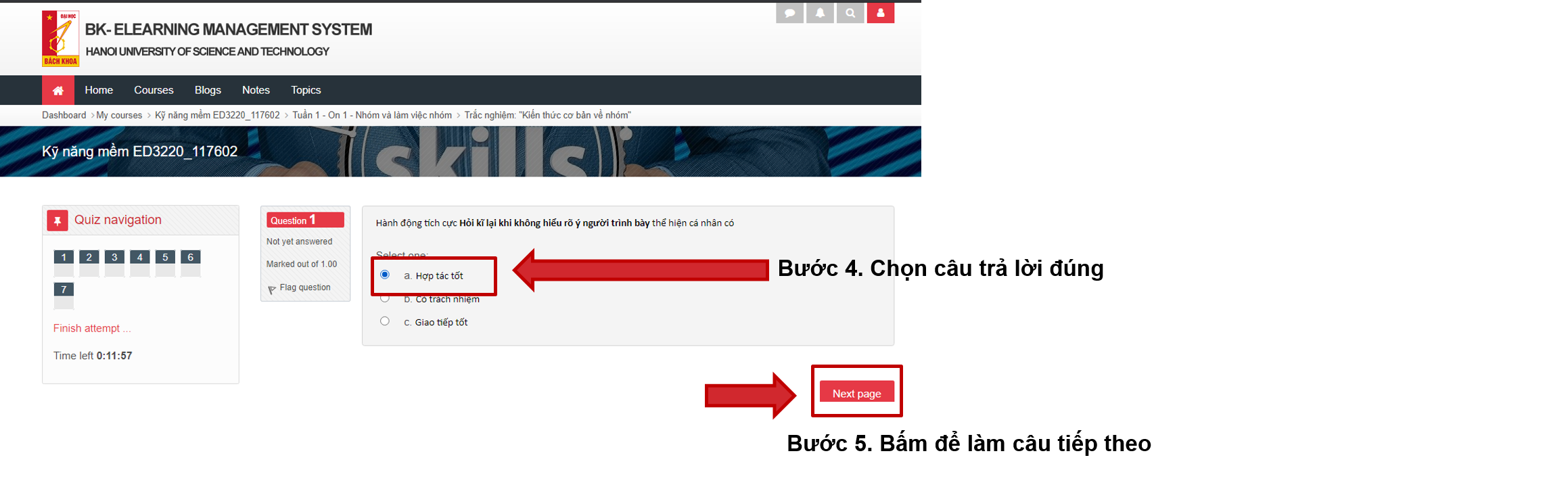Tiếp tục thực hiện bước 4 và 5 tại giao diện làm bài trắc nghiệm.