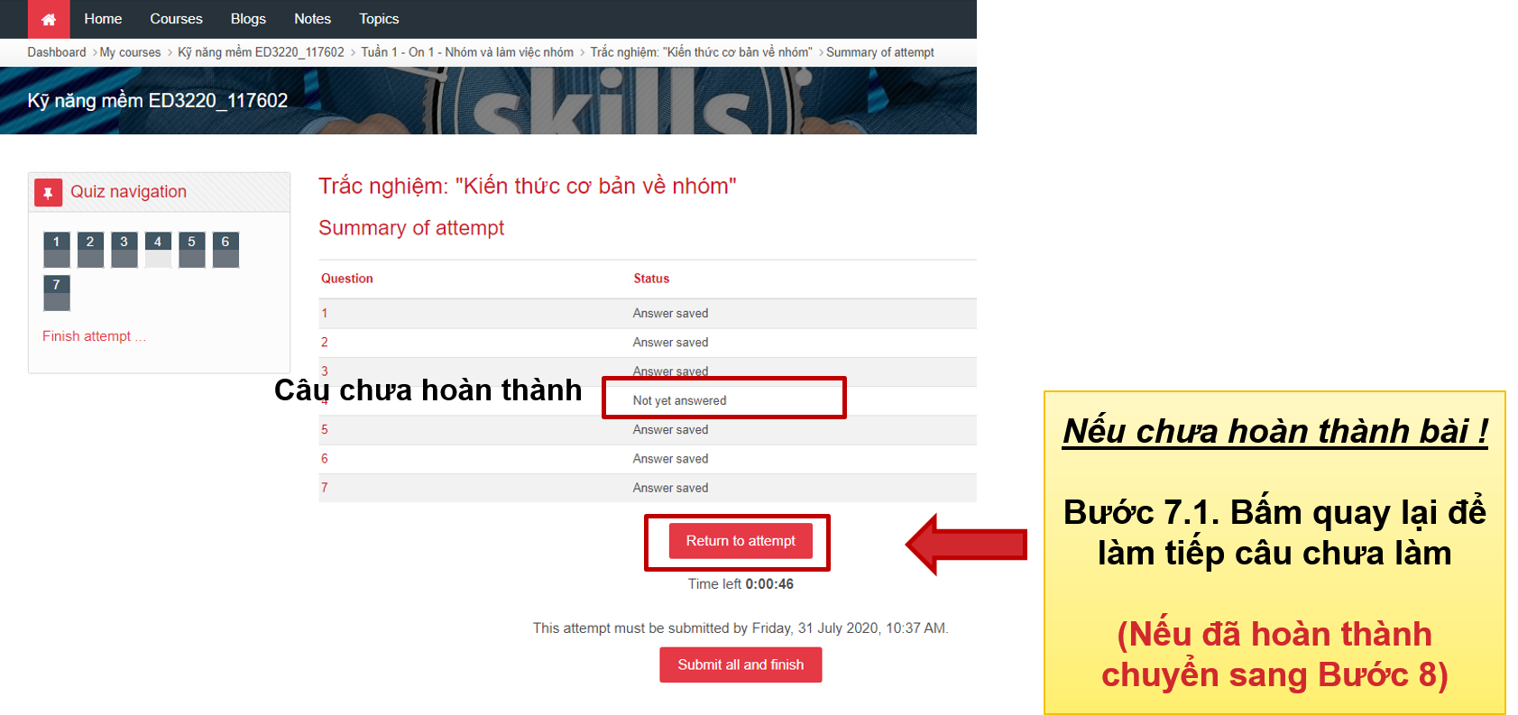 Bước 7.1. Bấm quay lại để làm tiếp câu chưa làm . Nếu chưa hoàn thành bài ! (Nếu đã hoàn thành chuyển sang Bước 8)