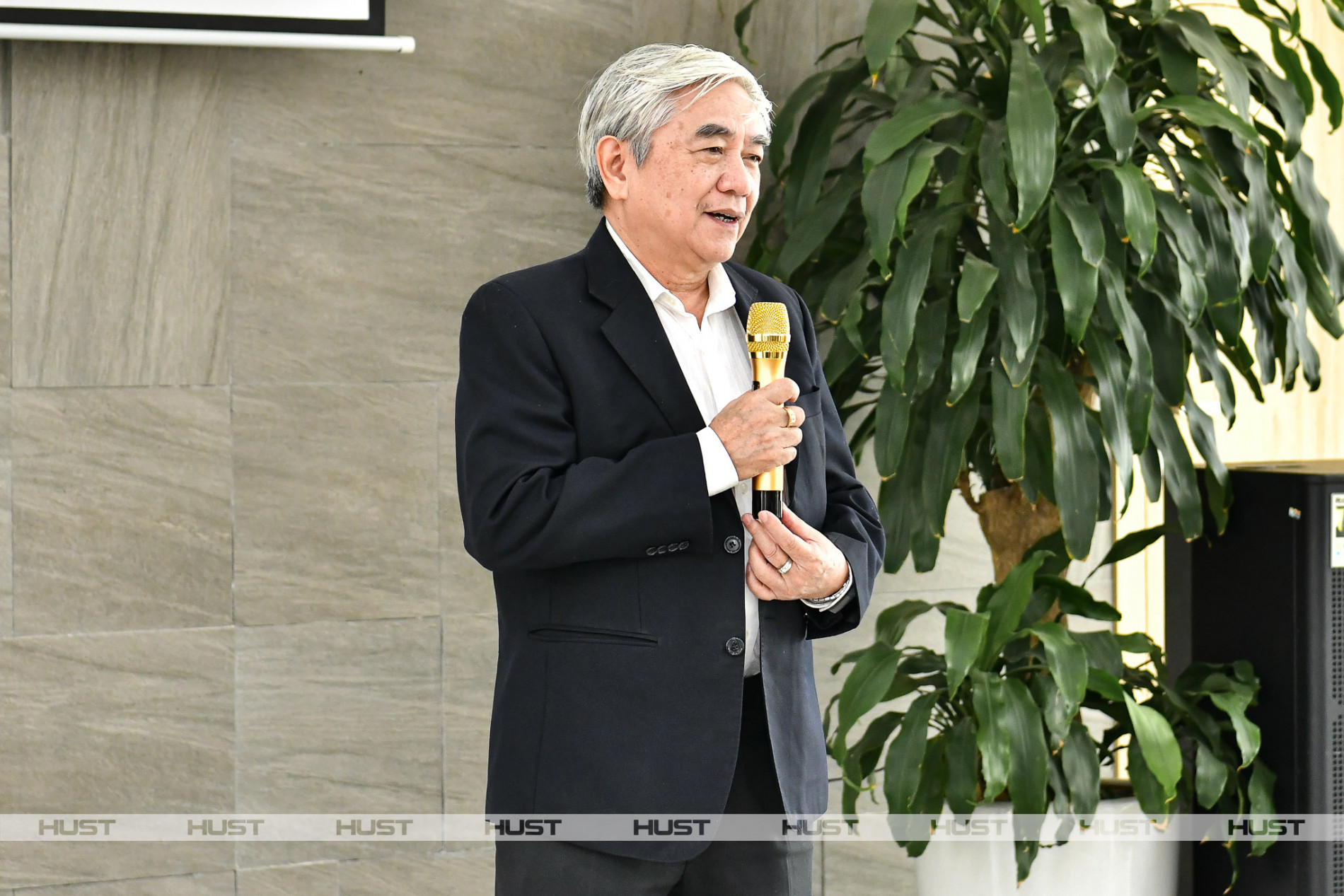 TS. Nguyễn Quân, Chủ tịch mạng lưới Cựu sinh viên Bách khoa Hà Nội phát biểu tại buổi lễ ngày 14/4. Ảnh: Vi Lê