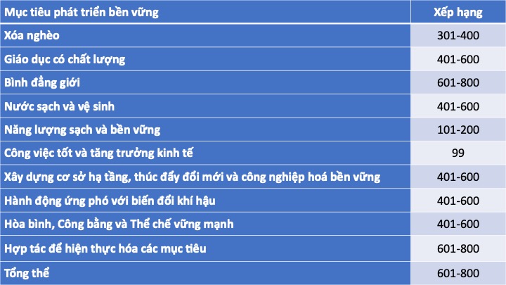Bảng xếp hạng năm nay bao gồm 1406 trường đại học đến từ nhiều quốc gia trên toàn thế giới. Các chỉ số được phân tích và sử dụng trong bảng xếp hạng này dựa trên 4 khía cạnh: nghiên cứu, đào tạo, quản lý và tiếp cận cộng đồng. Đây cũng là bảng xếp hạng duy nhất trên thế giới đánh giá các trường đại học dựa trên các mục tiêu phát triển bền vững của Liên Hợp Quốc.