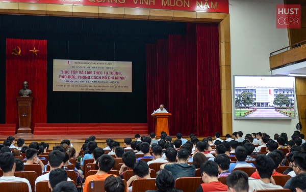 Ngày 12/5/2019, tại Hội trường C2, Trường ĐHBK Hà Nội tổ chức chương trình chuyên đề thời sự “Học tập và làm theo tư tưởng, đạo đức, phong cách Hồ Chí Minh” nhằm nâng cao nhận thức cho hơn 2.000 sinh viên năm thứ hai (khóa 62) về những nội dung cơ bản và giá trị to lớn của tấm gương và đạo đức Hồ Chí Minh dưới sự giảng dạy của GS Hoàng Chí Bảo - nguyên Ủy viên Hội đồng Lý luận Trung ương, Chuyên gia cao cấp Học viện Chính trị Quốc gia Hồ Chí Minh.