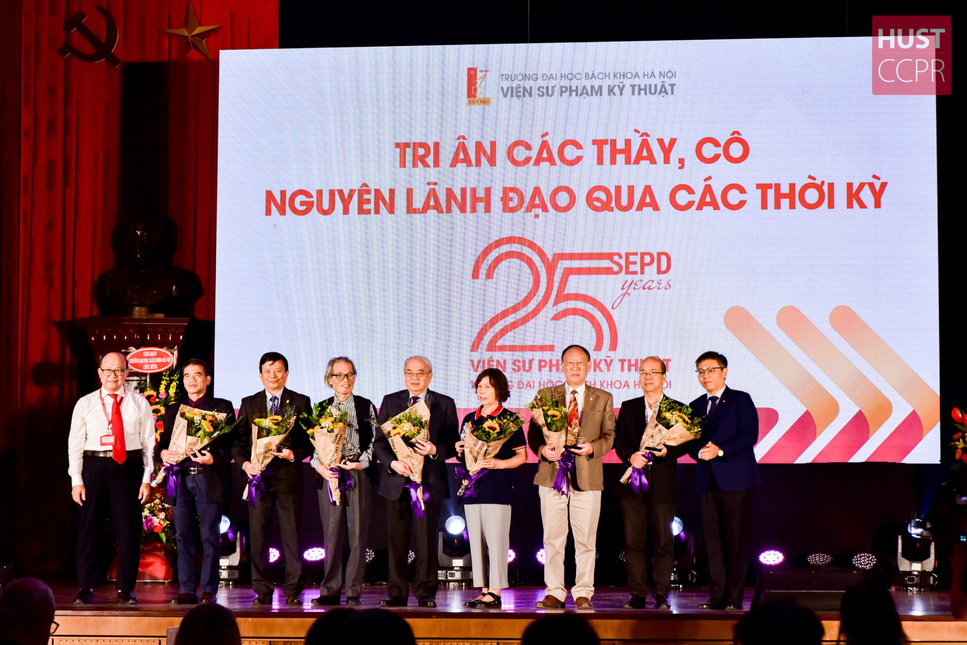 Để tạo nên Viện Sư phạm Kỹ thuật với bề dày 25 năm, không thể không kể đến công lao của những người đi trước, những người đã làm nên lịch sử của Viện. Tại buổi Lễ kỷ niệm, PGS. Huỳnh Quyết Thắng, Hiệu trưởng Bách khoa Hà Nội và PGS. Lê Hiếu Học, Viện trưởng Viện Sư phạm Kỹ thuật tặng hoa và quà tri ân tới các thầy, cô nguyên lãnh đạo Viện Sư phạm Kỹ thuật các thời kỳ.