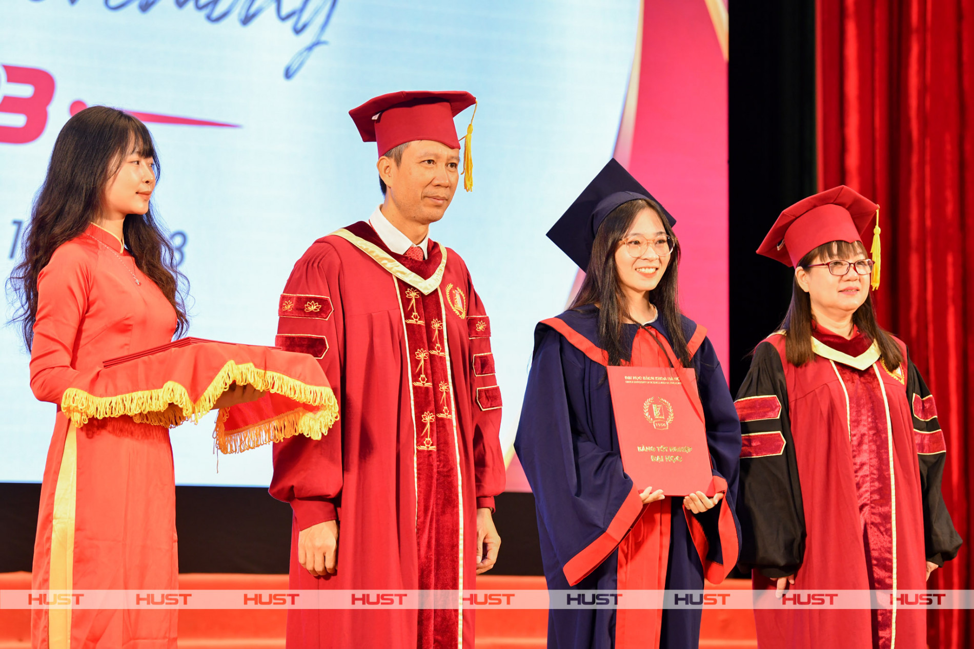 Đặc biệt, lần đầu tiên trong lịch sử Bách khoa Hà Nội, sinh viên tốt nghiệp xuất sắc được trao tặng kỷ niệm chương mạ vàng. Đây là biểu trưng cho sự cố gắng, nỗ lực suốt 4-5 năm học của các bạn. Những khó khăn, vất vả của sinh viên đã đúc kết lại chiếc kỷ niệm chương cao quý và ý nghĩa này.