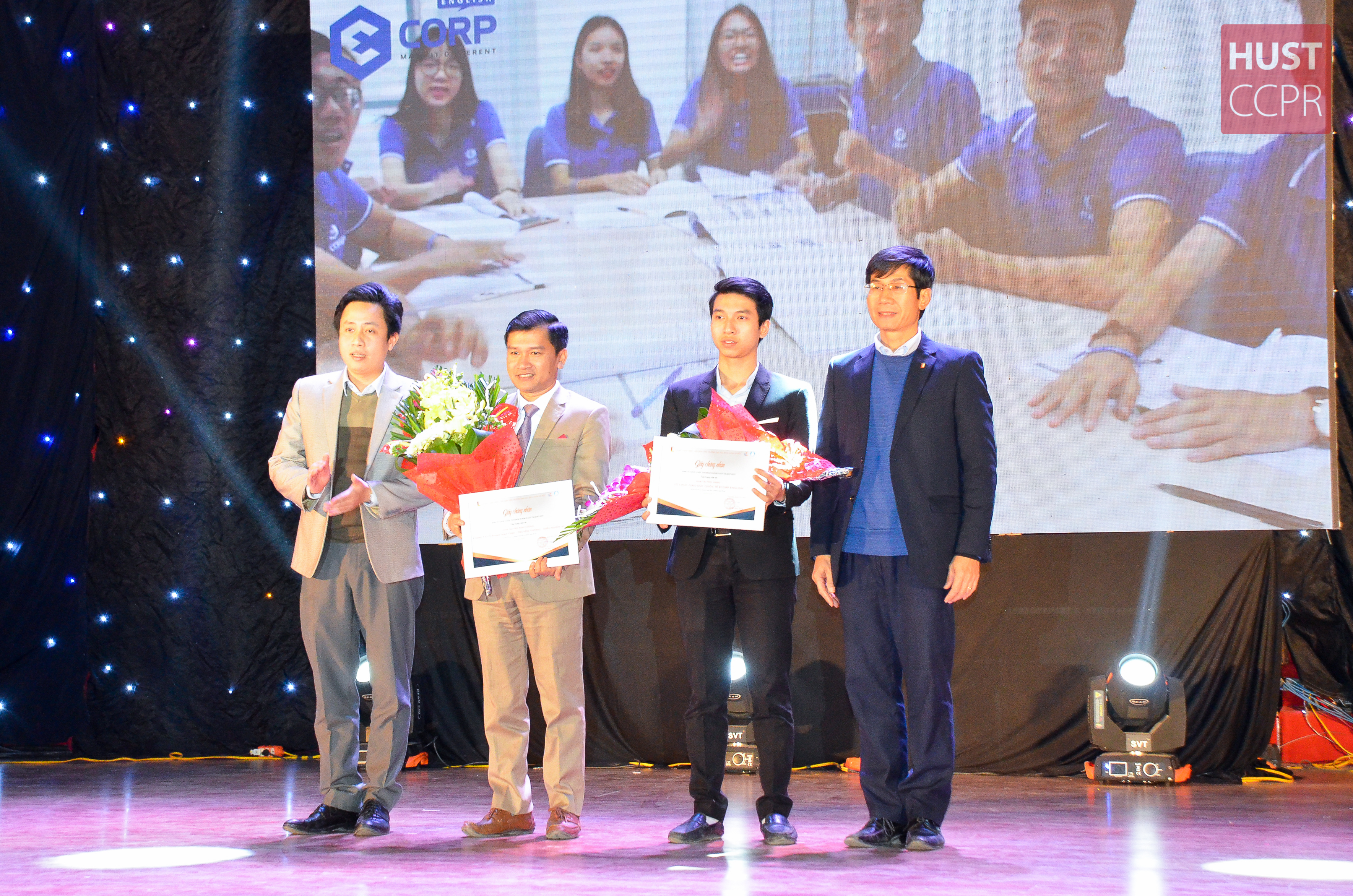 PGS Phạm Hoàng Lương và TS Lê Đức Tùng trao hoa và chứng nhận cho các nhà tài trợ