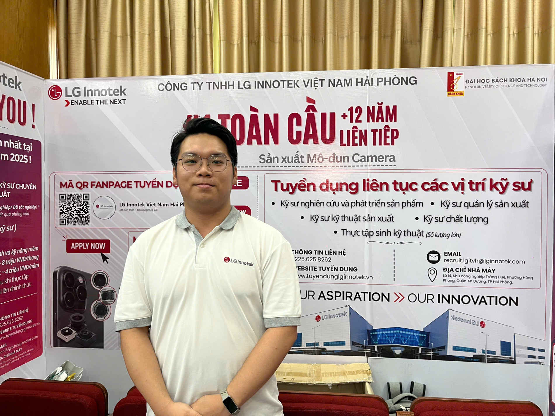 Về phía đại diện Công ty TNHH LG Innotek, ông Phạm Doãn Linh Phong – Chuyên viên Phát triển nhân sự – cho biết “Chúng tôi luôn ưu tiên tham gia các chương trình Job Fair do Đại học Bách khoa Hà Nội tổ chức. Với LG Innotek, đây là sự kiện chiến lược trong năm, đóng vai trò quan trọng trong việc tiếp cận và tuyển dụng nguồn nhân lực chất lượng cao từ sinh viên chuẩn bị tốt nghiệp đến những ứng viên đang tìm kiếm cơ hội thực tập.”