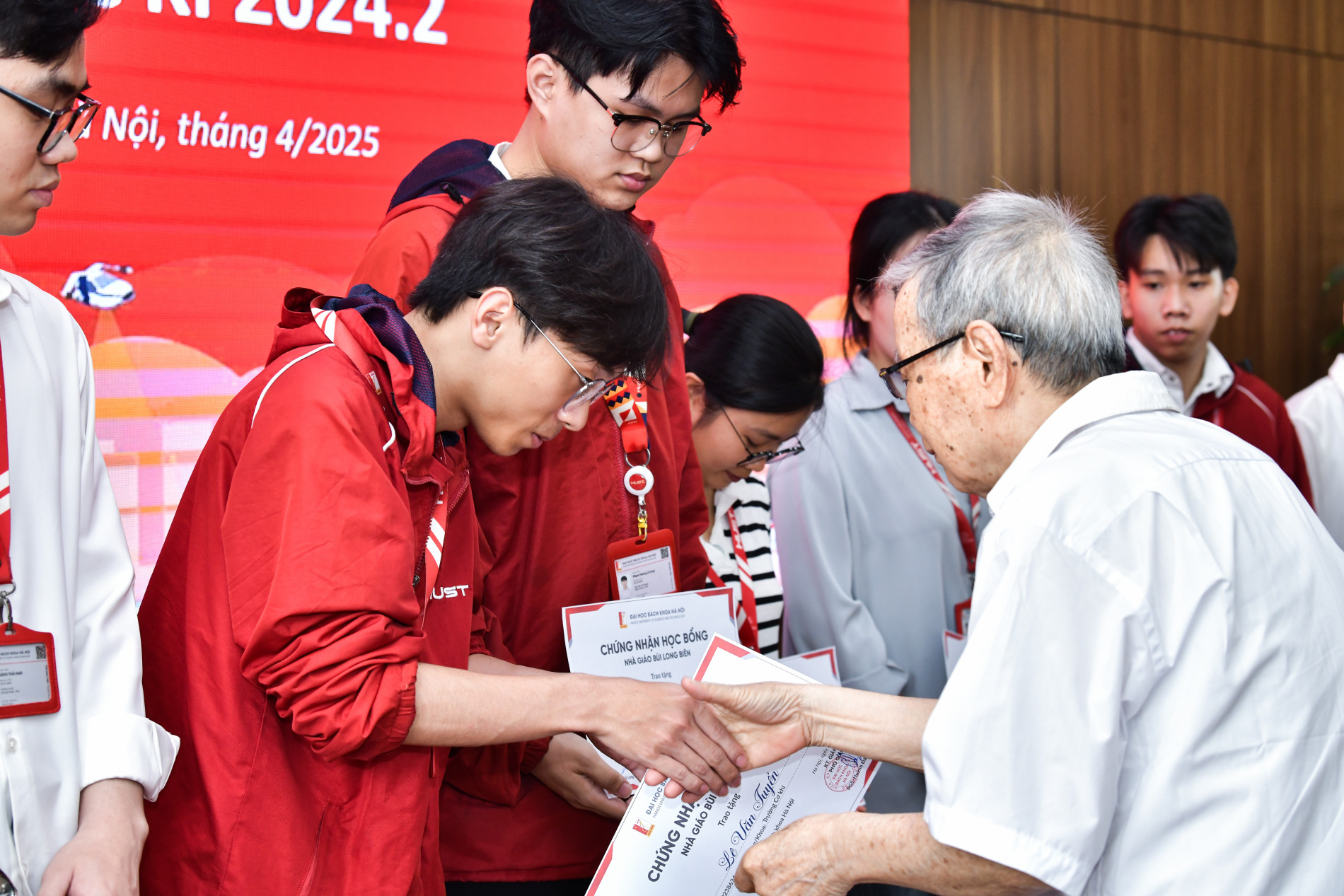 PGS. Bùi Long Biên trao học bổng cho sinh viên Bách khoa Hà Nội. Ảnh: Duy Thành