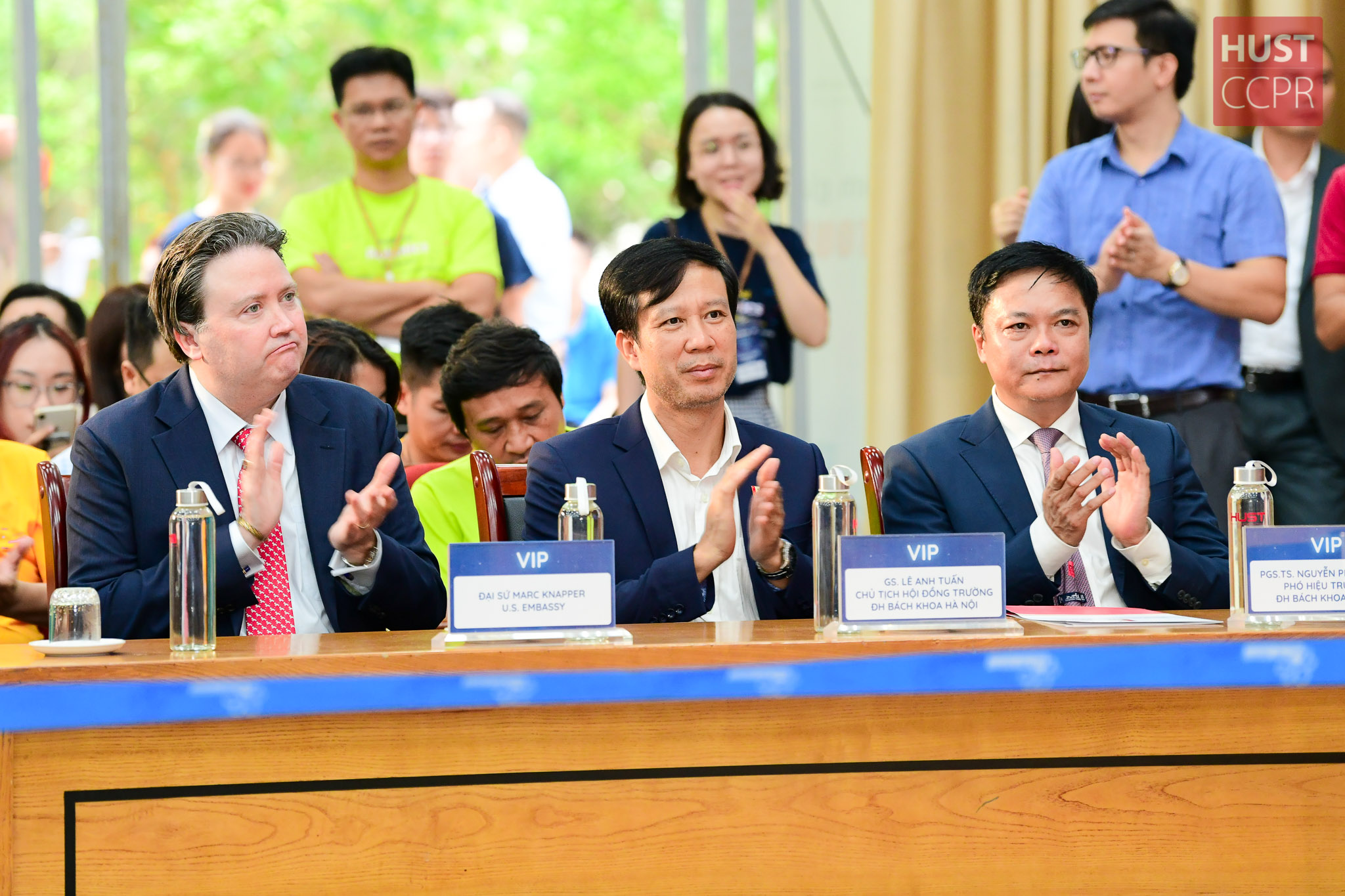 Từ trái qua phải: ông Marc Evans Knapper, Đại sứ Hoa Kỳ tại Việt Nam; GS. Lê Anh Tuấn, Chủ tịch Hội đồng Trường ĐH Bách khoa Hà Nội; PGS. Nguyễn Phong Điền, Phó Hiệu trưởng ĐH Bách khoa Hà Nội