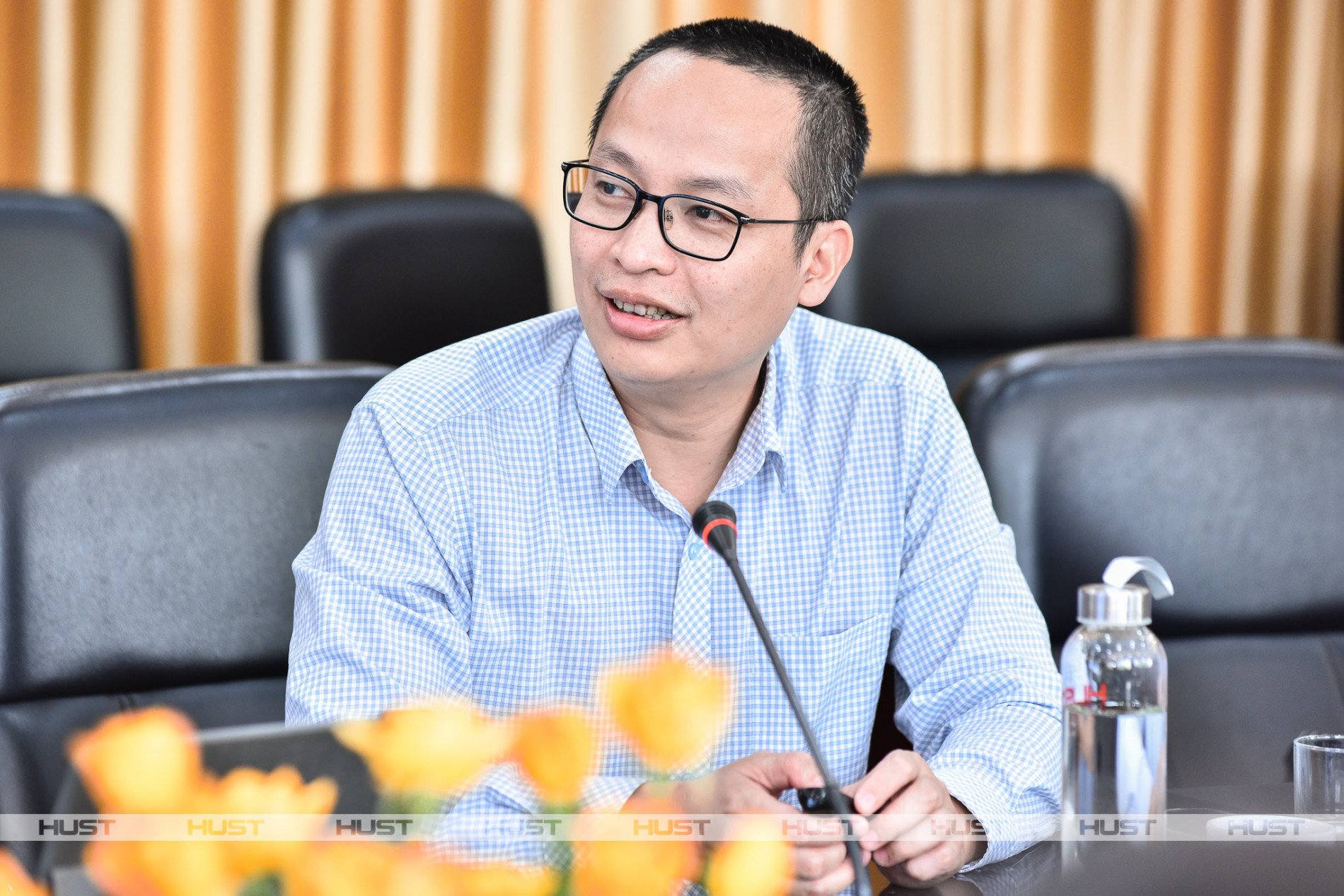 PGS. Huỳnh Đăng Chính, Phó Giám đốc Đại học Bách khoa Hà Nội (áo sơ mi trắng) phát biểu tại buổi lễ ngày 15/4. Ảnh: Vi Lê