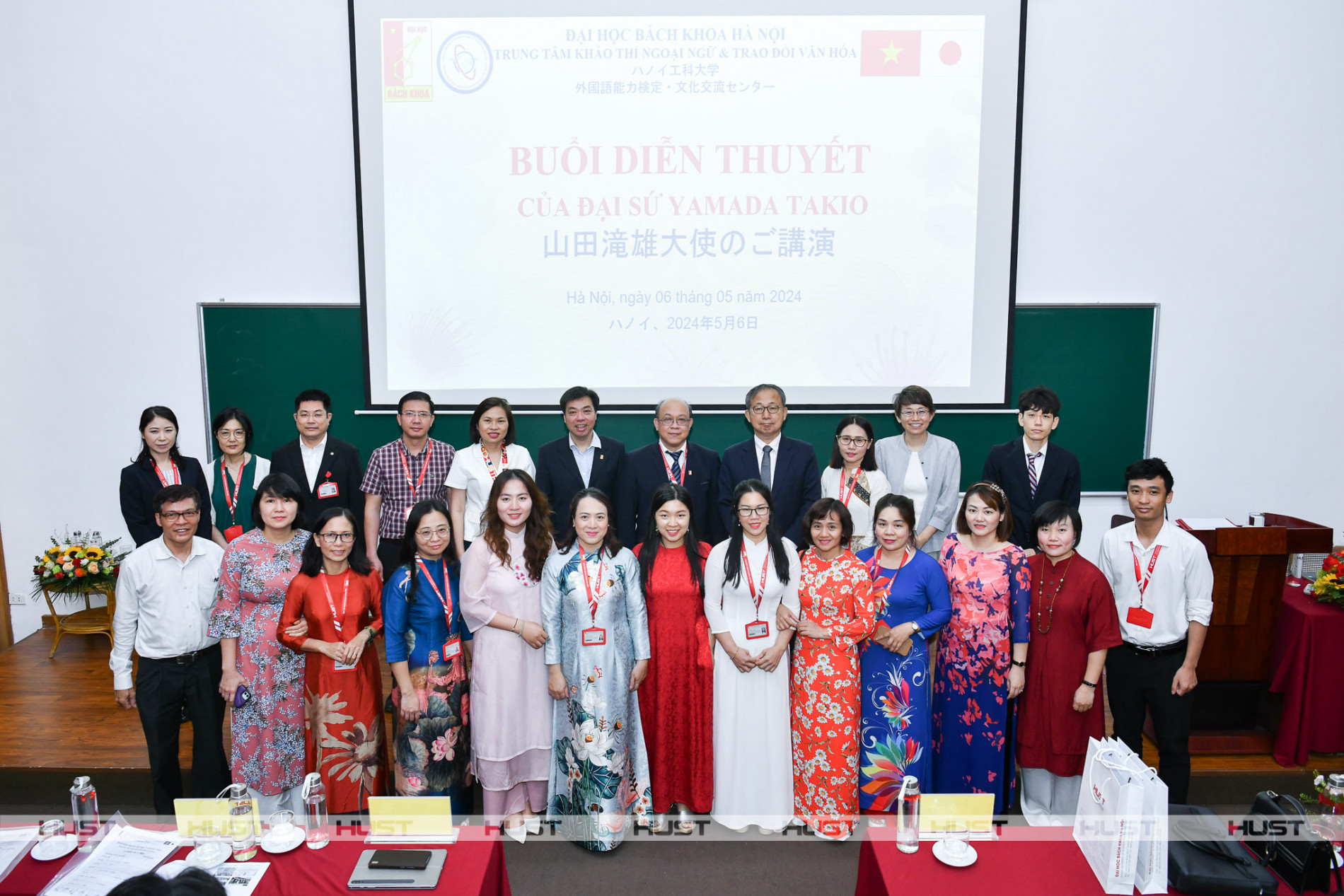 Đại sứ Đặc mệnh toàn quyền Nhật Bản Yamada Takio chia sẻ niềm tin với sinh viên Bách khoa Hà Nội trong buổi diễn thuyết sáng nay (6/5) tại đại học: “Sinh viên Bách khoa Hà Nội có thể góp phần giúp Nhật Bản hiện thực hóa những dự định phát triển trong tương lai”PGS. Huỳnh Quyết Thắng và cán bộ giảng viên Đại học Bách khoa Hà Nội chụp ảnh cùng đoàn đại biểu Đại sứ quán Nhật Bản