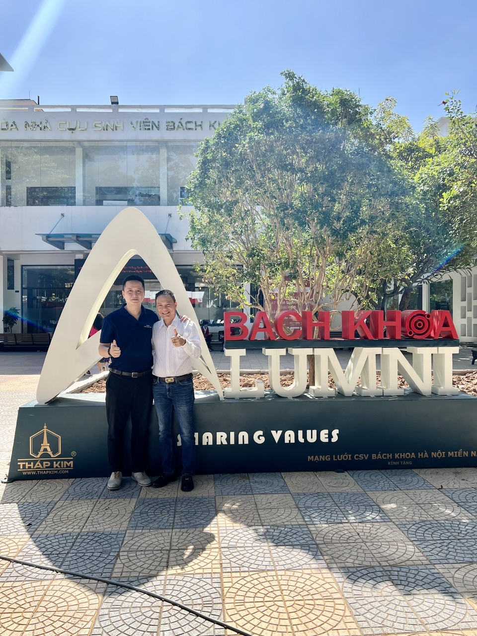 Anh Nguyễn Quốc Tiến (phải) chụp hình lưu niệm cùng biểu tượng Tòa nhà CSV Bách khoa do anh tài trợ
