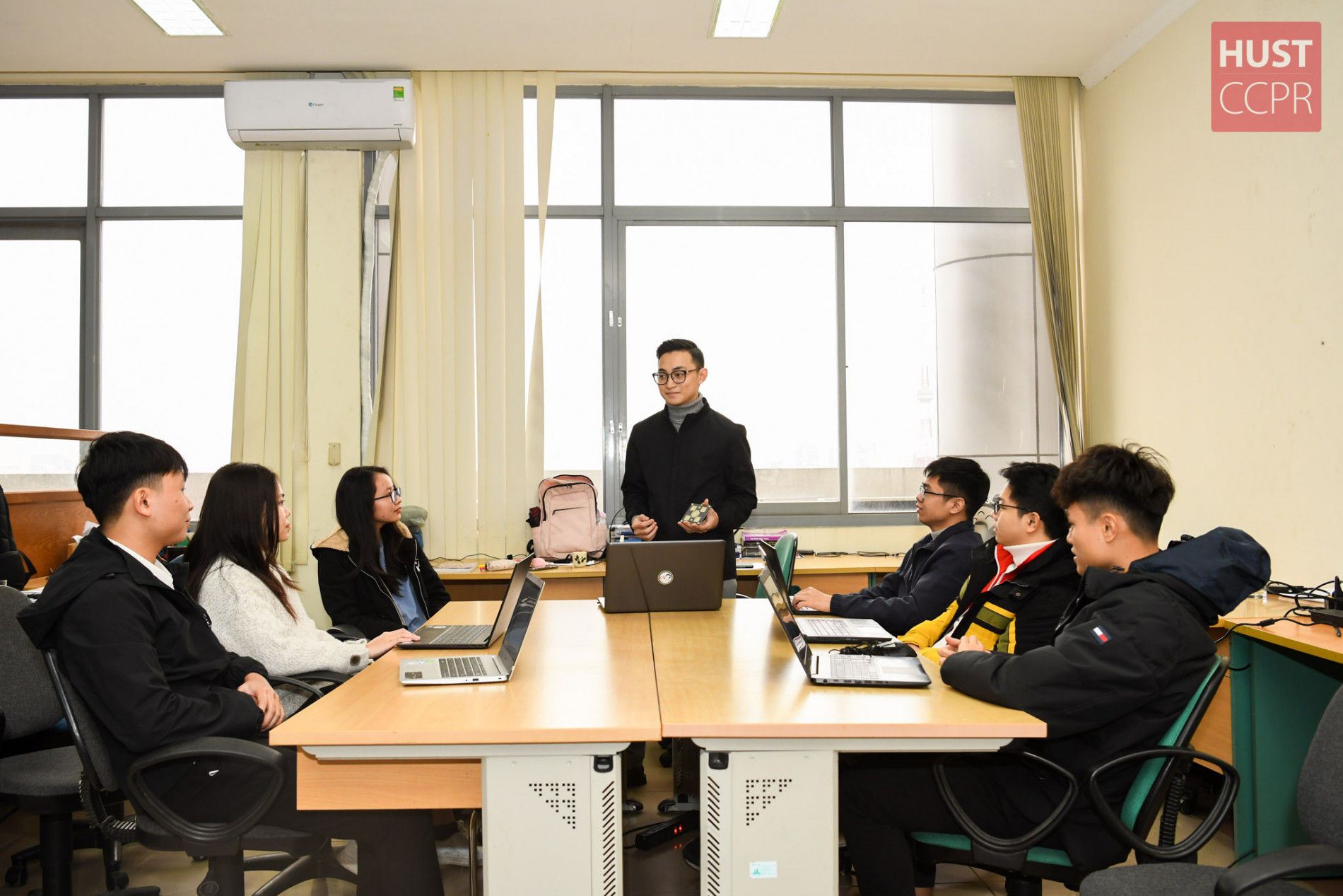 Sinh viên Bùi Trần Hiển (đứng) giải thích với các thành viên trong CRD lab về đề tài nghiên cứu của mình. Ảnh: CCPR