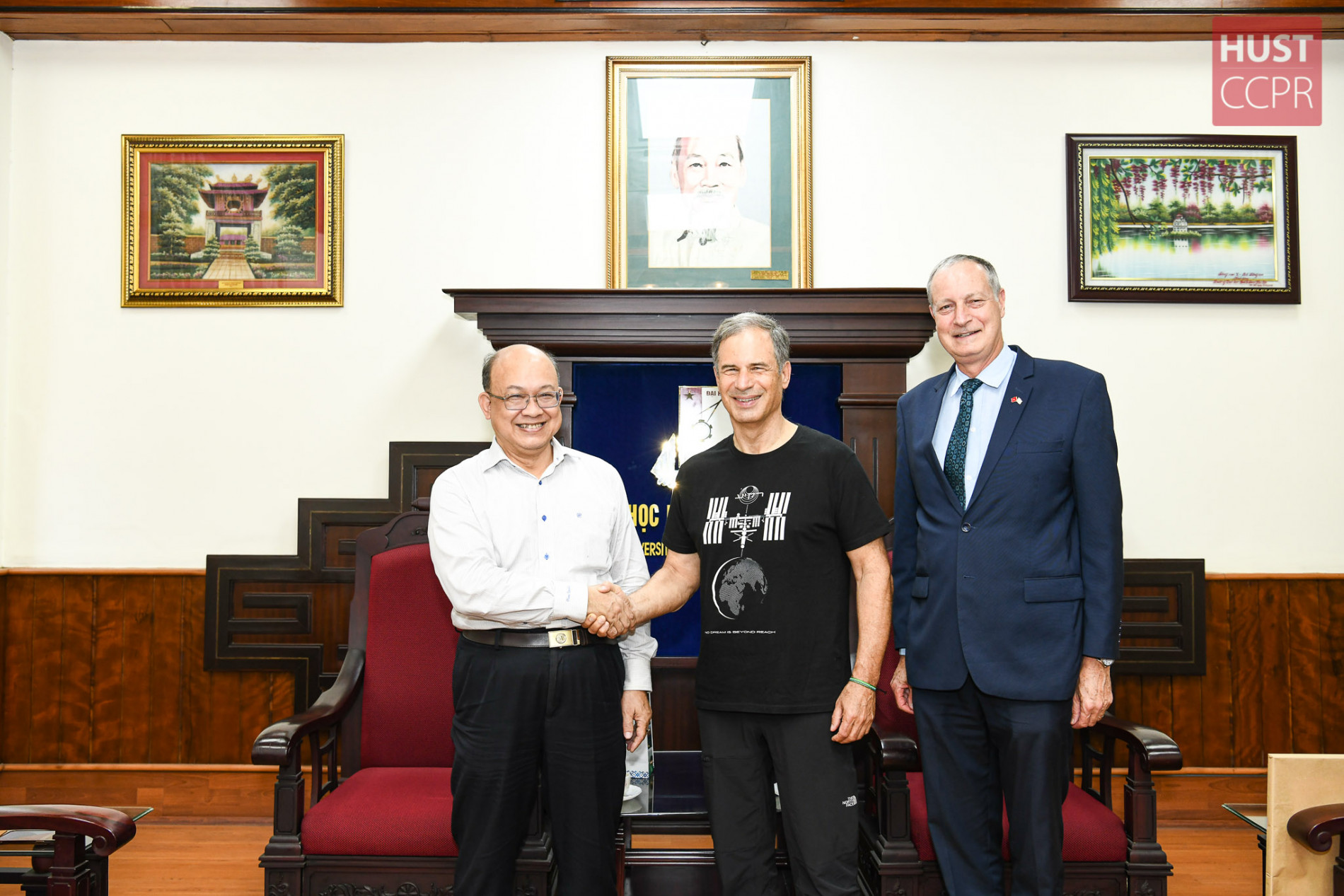 Hiệu trưởng Bách khoa Hà Nội Huỳnh Quyết Thắng (trái) đón tiếp nhà du hành vũ trụ Eytan Stibbe ngày 4/10. Ảnh: Duy Thành