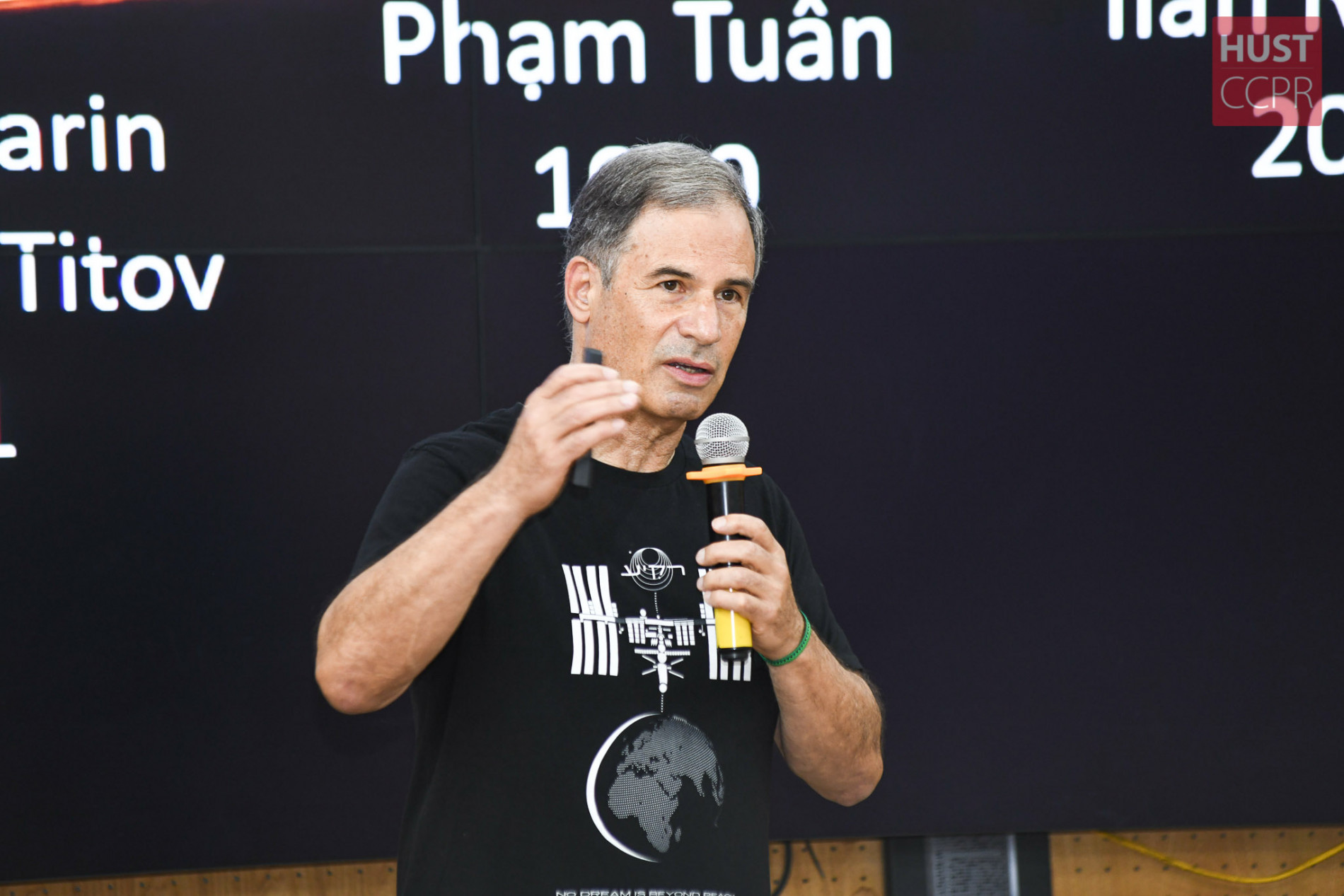 Nhà du hành vũ trụ Eytan Stibbe chia sẻ về chuyến đi của mình với sinh viên Bách khoa Hà Nội ngày 4/10. Ảnh: Duy Thành
