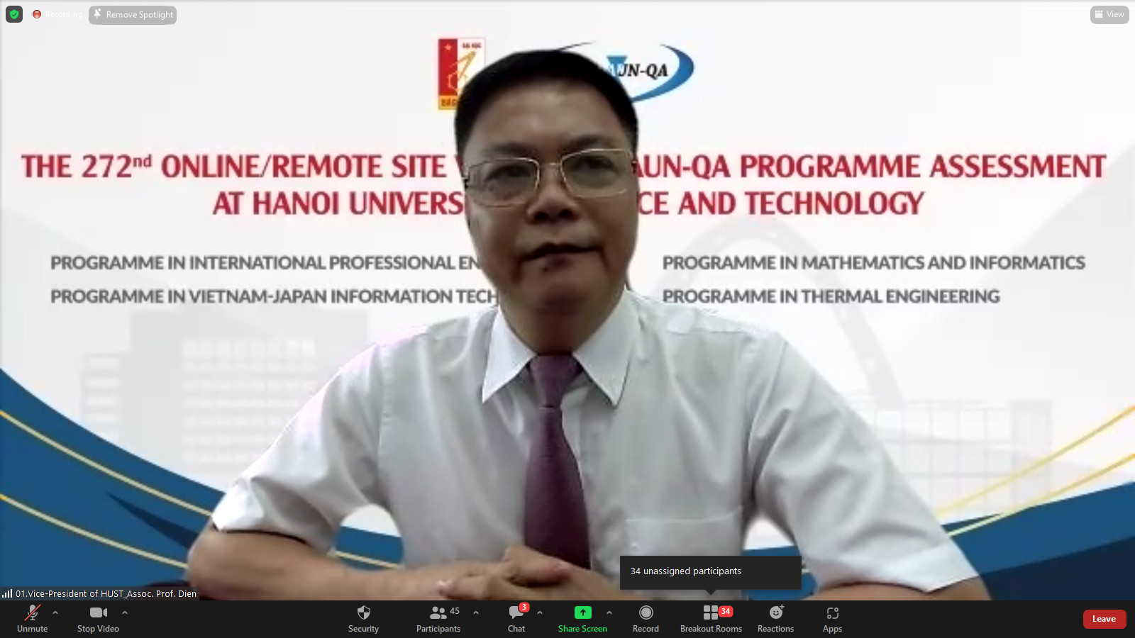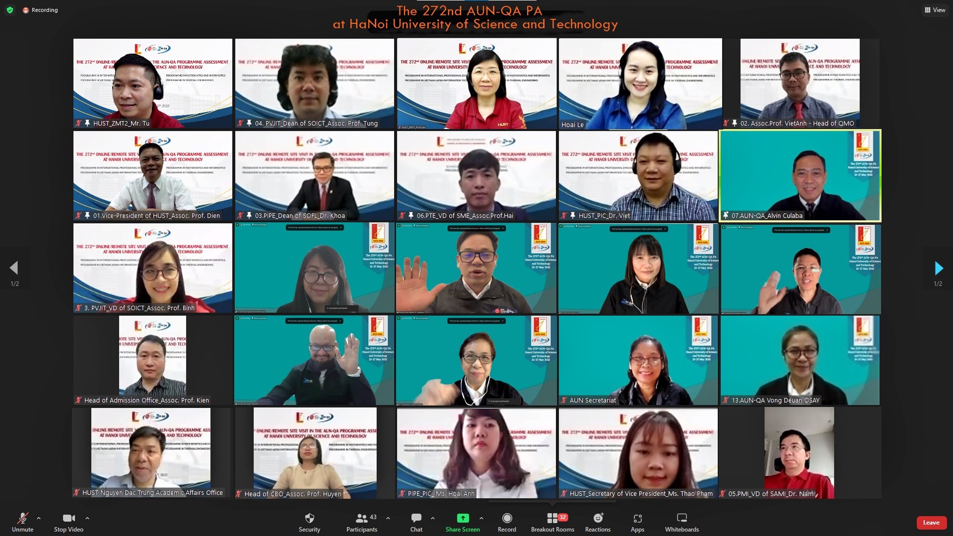 Lãnh đạo và cán bộ các Trường và Viện có chương trình đào tạo được kiểm định theo chuẩn AUN-AQ tại lễ khai mạc ngày 23/5. Ảnh chụp màn hình.