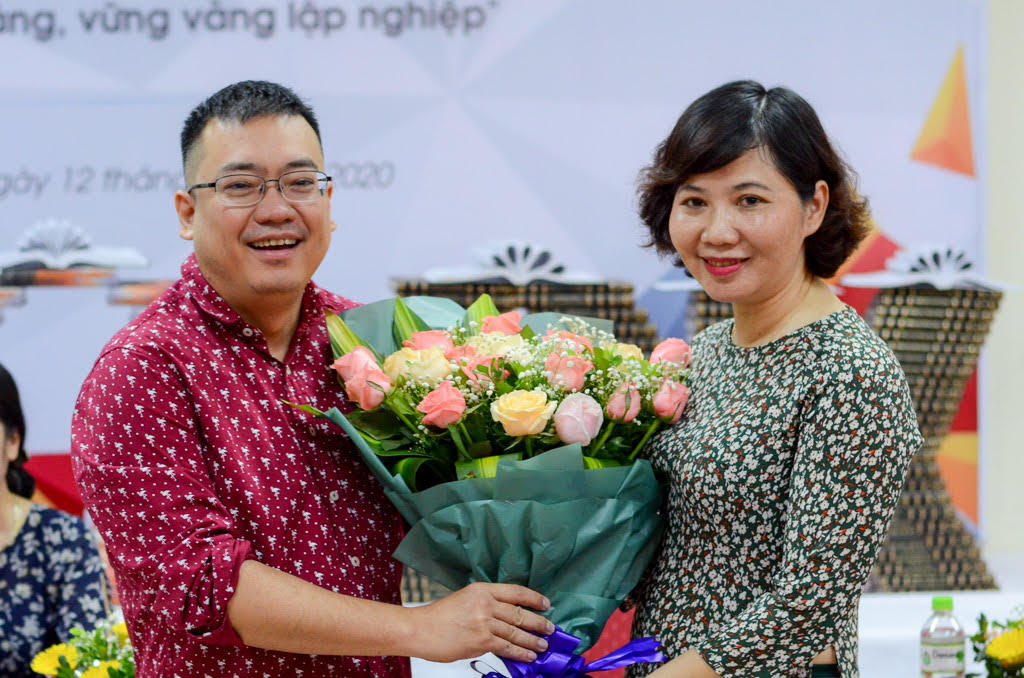 Thạc sĩ Hà Thị Huệ, giám đốc Thư viện Tạ Quang Bửu, trao tặng bó hoa tri ân cho ông Nguyễn Cảnh Bình, Chủ tịch hội đồng Công ty Sách Alpha