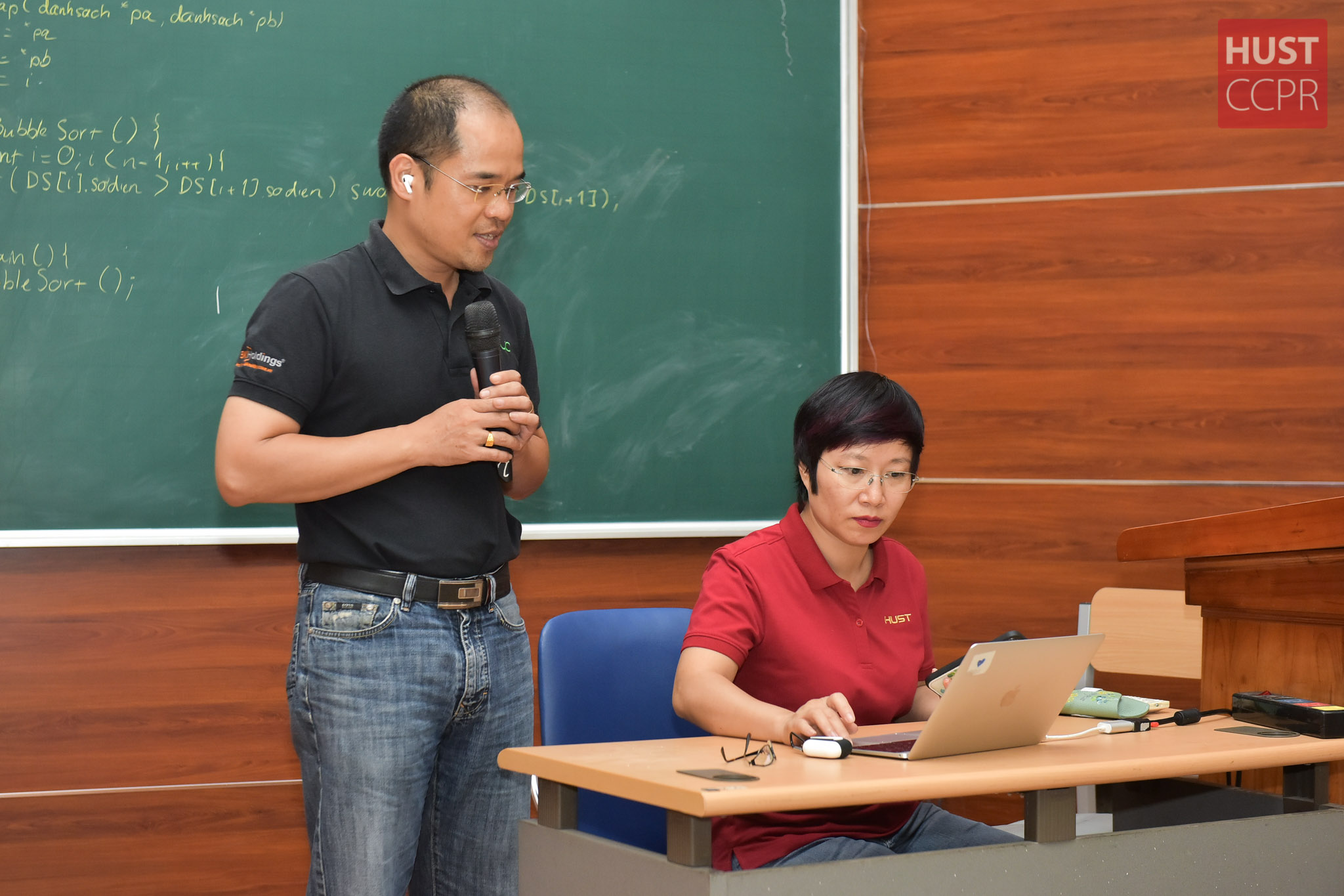 PGS. Nguyễn Thị Hồng Minh (phải), Phó Trưởng phòng Quản lý nghiên cứu và ông Phạm Tuấn Hiệp, Giám đốc Công ty Quản lý Quỹ BK Fund đang chia sẻ thông tin và kiến thức tới sinh viên trong Ngày Tư vấn hướng dẫn đội thi 21/7. Ảnh: Ngọc Kiên